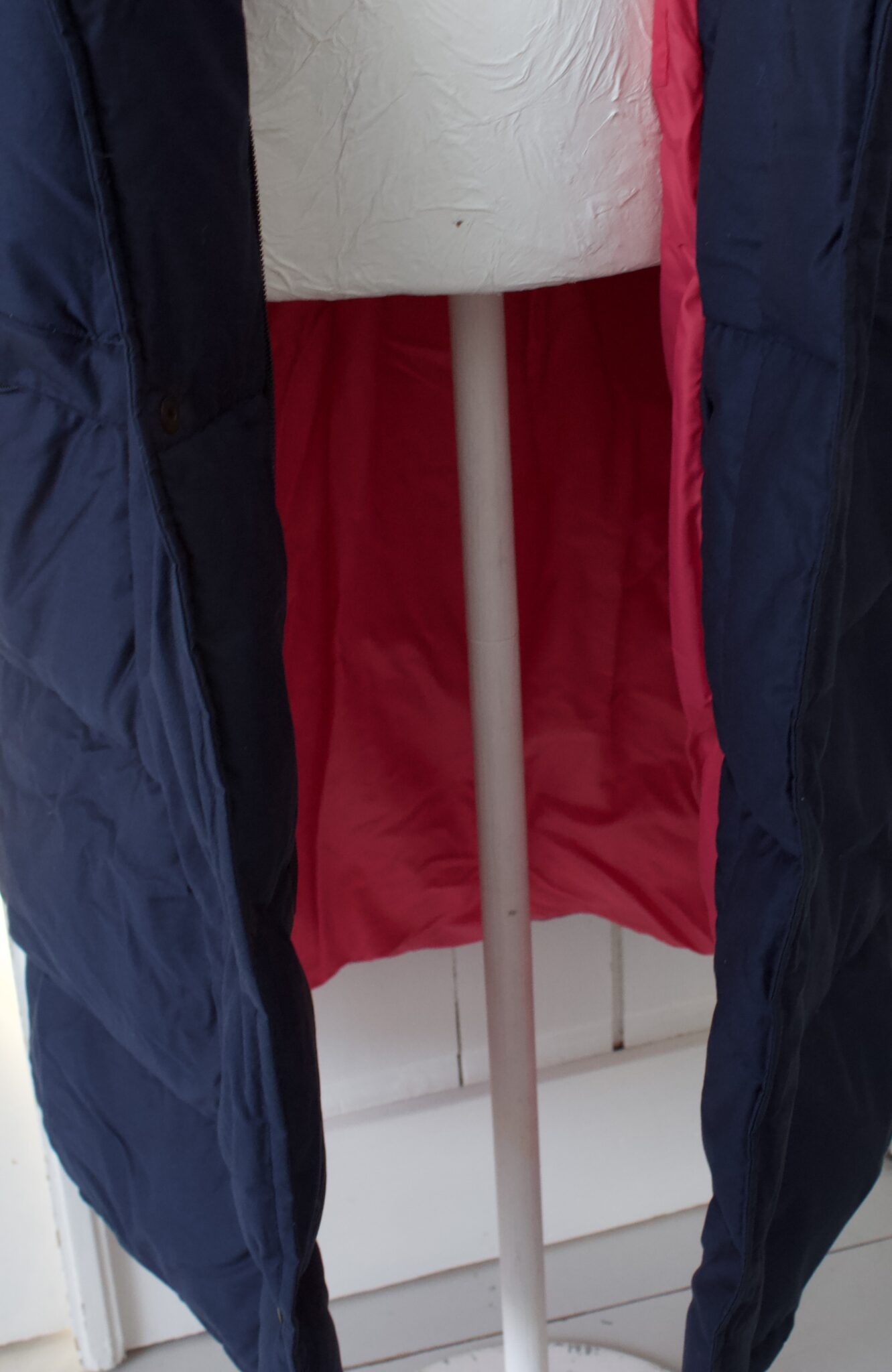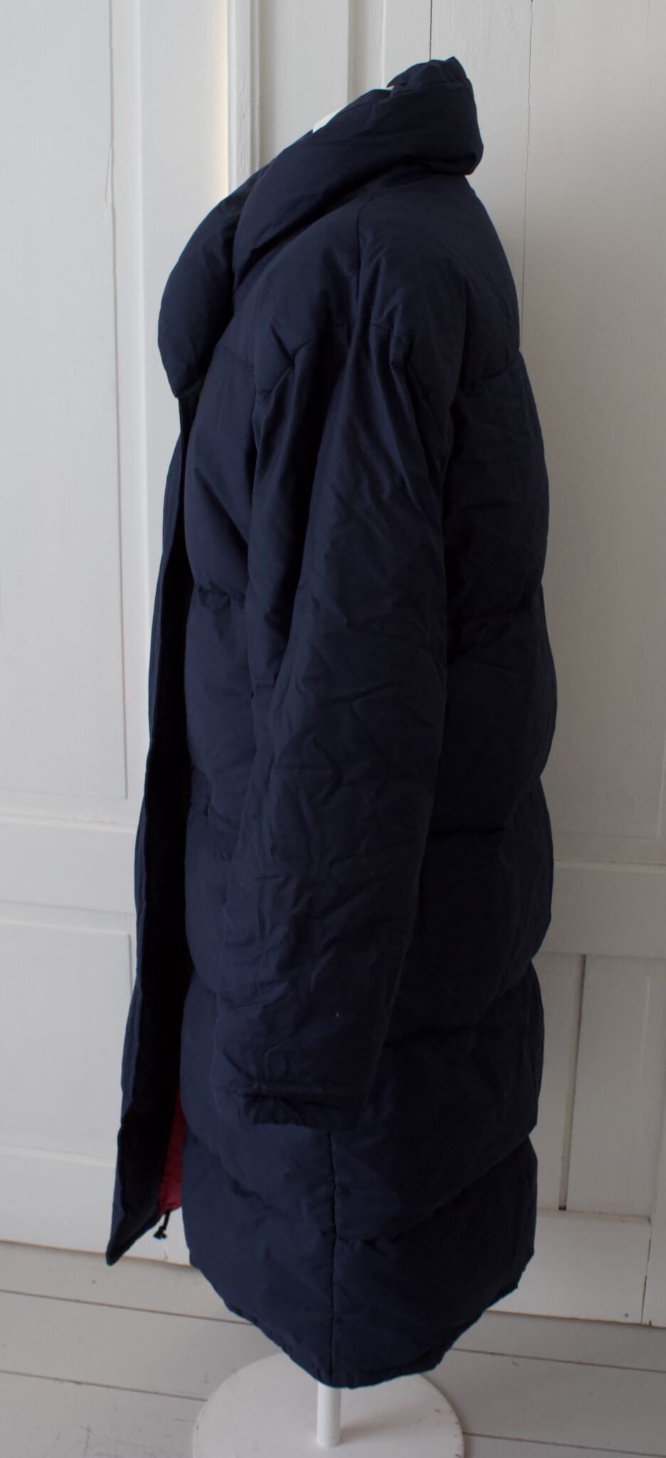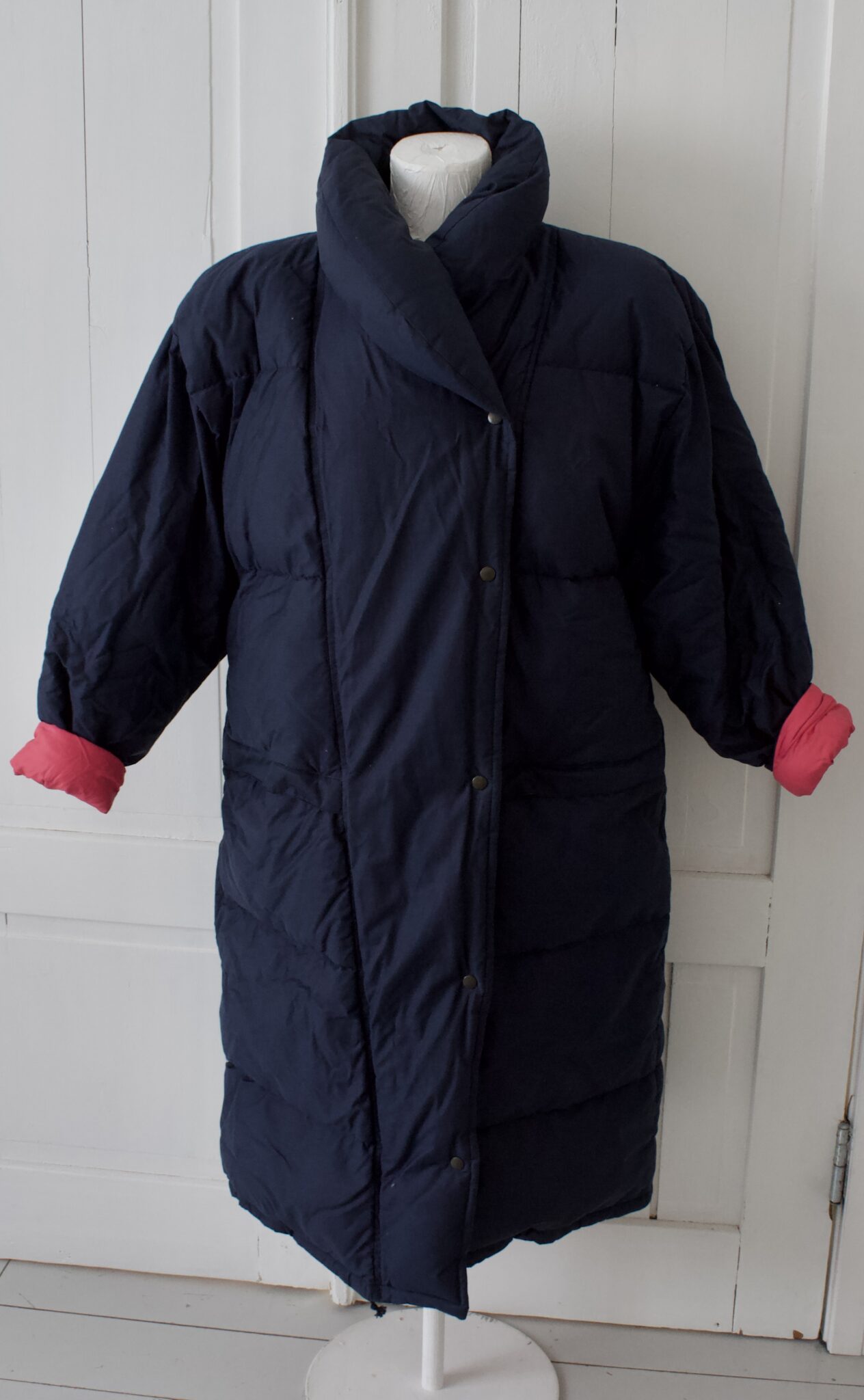 Upea, muhkea 90-luvun tummansininen pitkä vanutäytteinen toppatakki, jossa sisäpuoli aniliininpunainen.