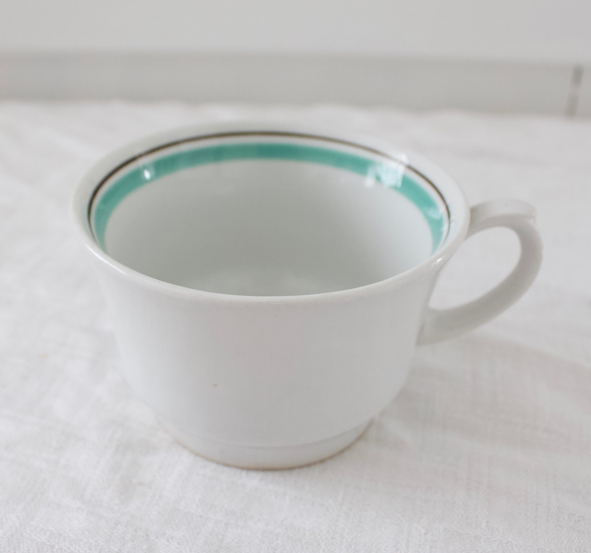 Arabian valkoinen kahvikuppi vihreällä raidalla.