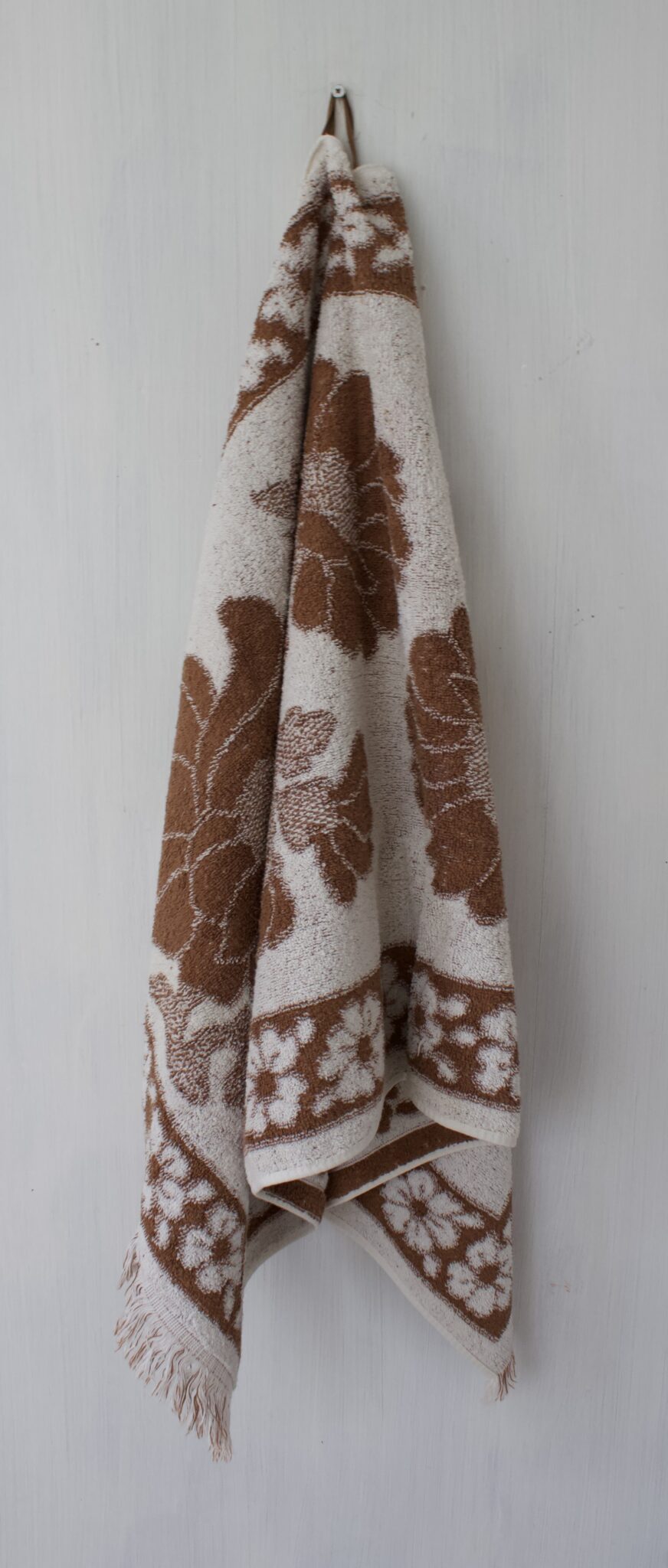 Ruskea valkoinen froteinen vintage käsipyyhe, jossa kukallista kuviota.