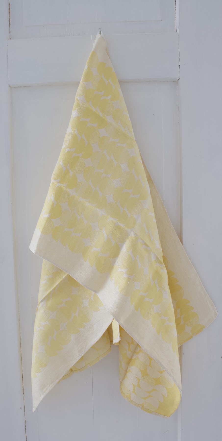 Keltainen pellava astiapyyhe, jossa pitkällä sivulla ripustuslenkki.