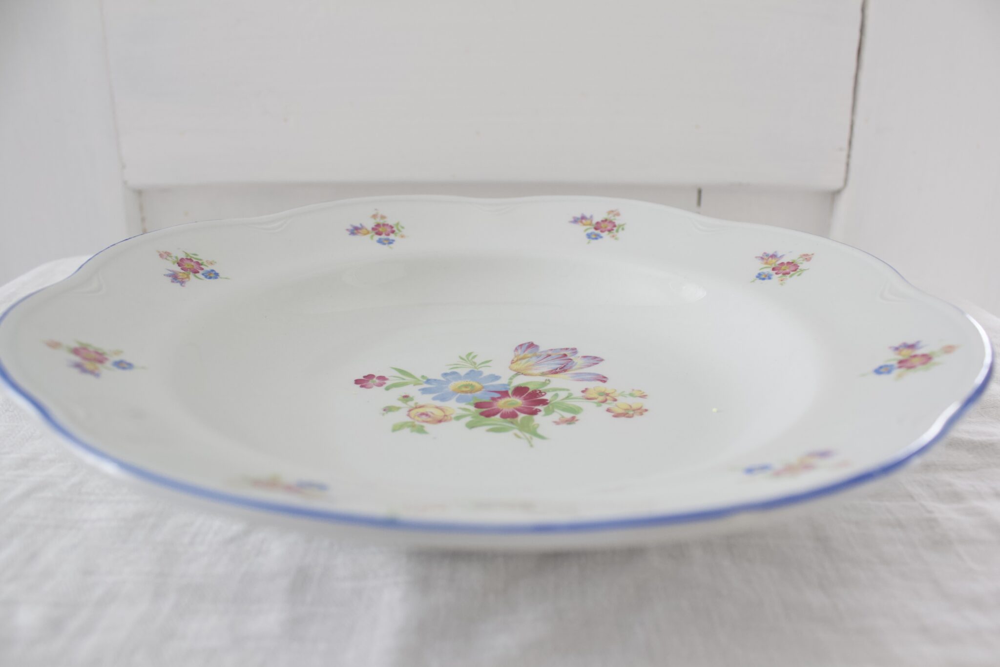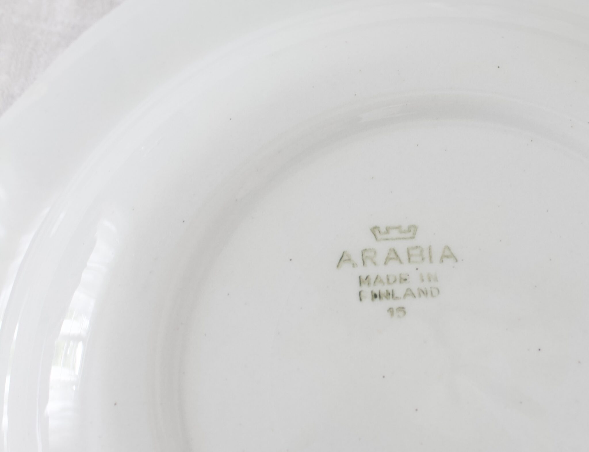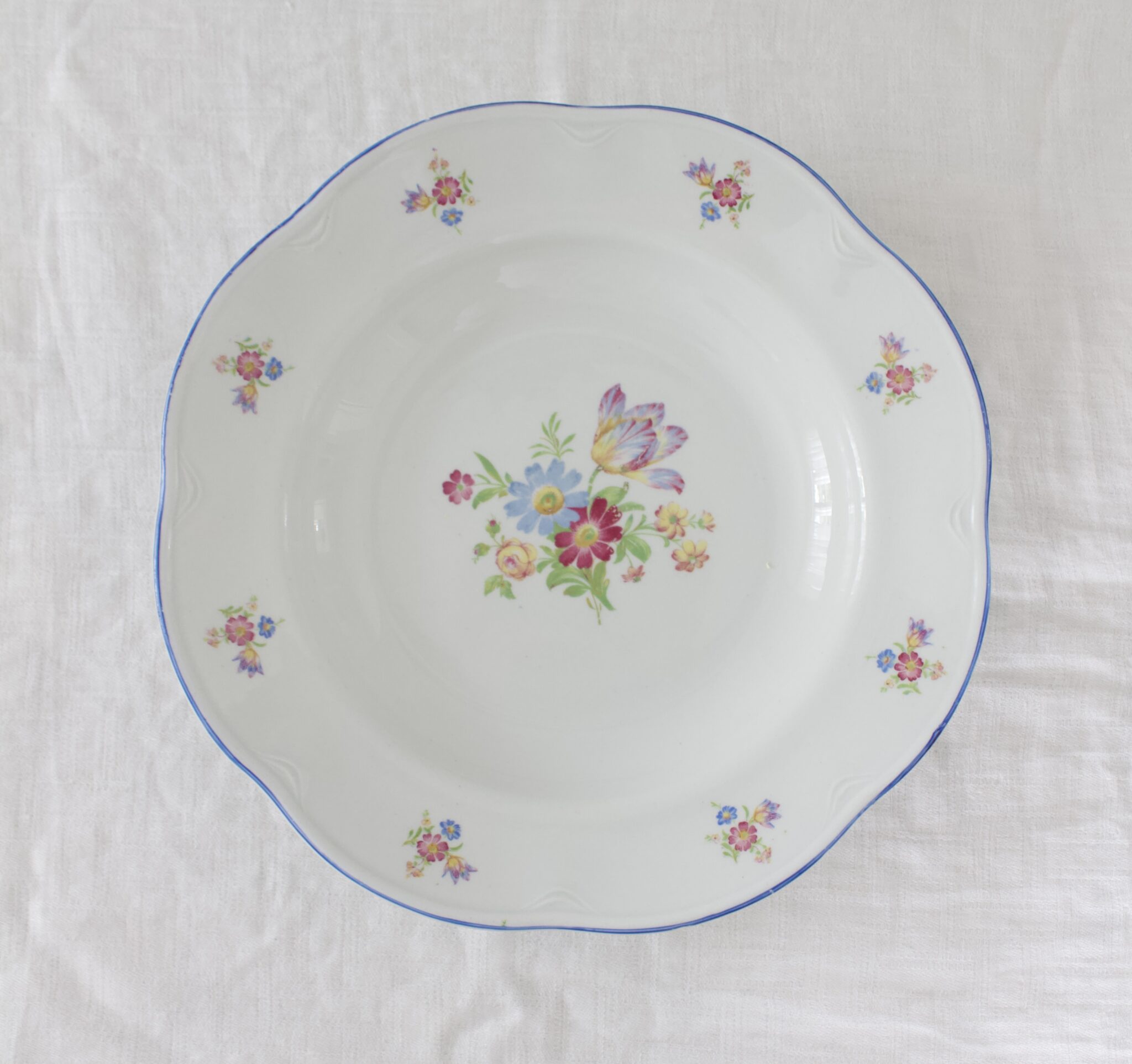 Kaunis valkoinen Arabian syvälautanen, jossa reunalla ohut sininen raita ja ihanat kukkakuviot.