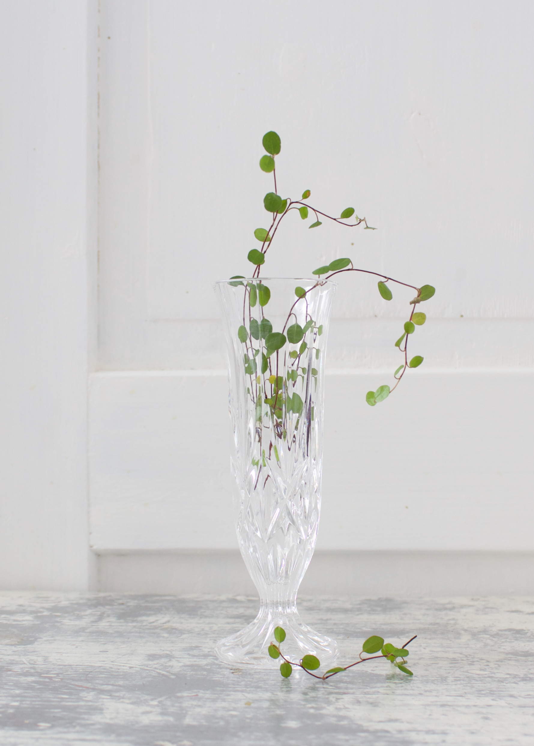 Kaunis jalallinen lasimaljakko, jonka korkeus 16,7 cm. Kaunis vaikka yhdelle kukalle.