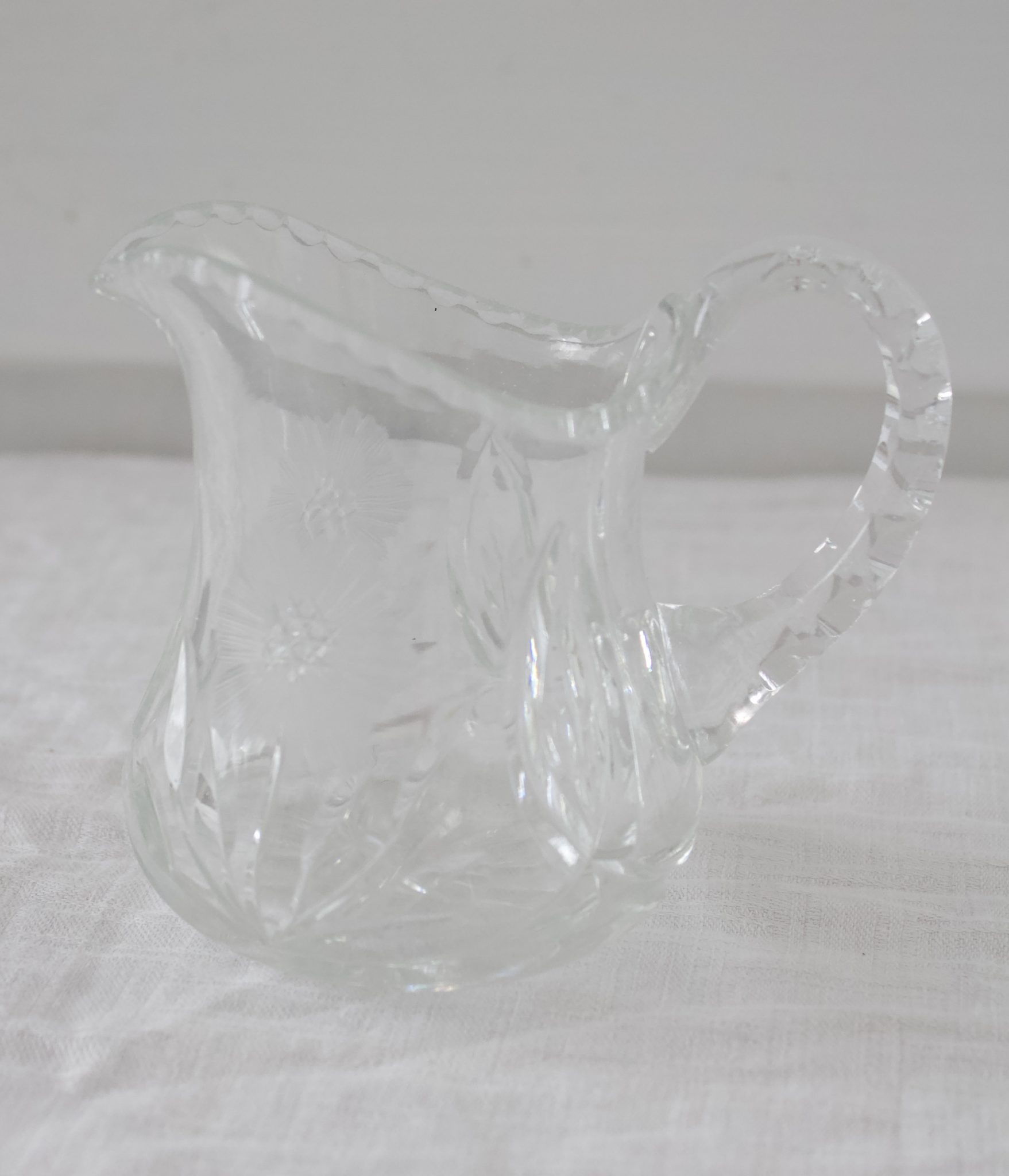 Lasinen kaunis kermakko, jossa hiottu kukkakuvio.