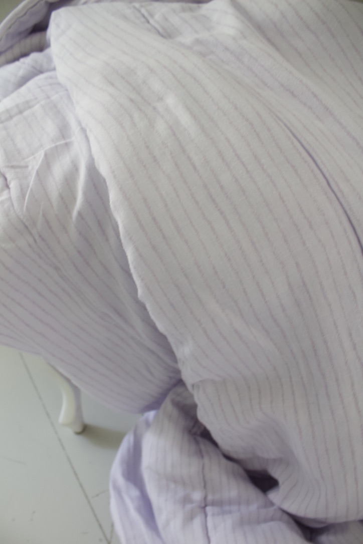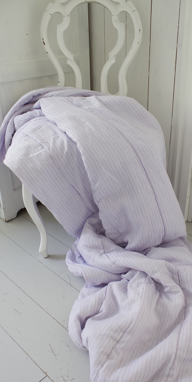 Lila raidallinen puuvillainen vintage täkki, jossa vanutäyte.