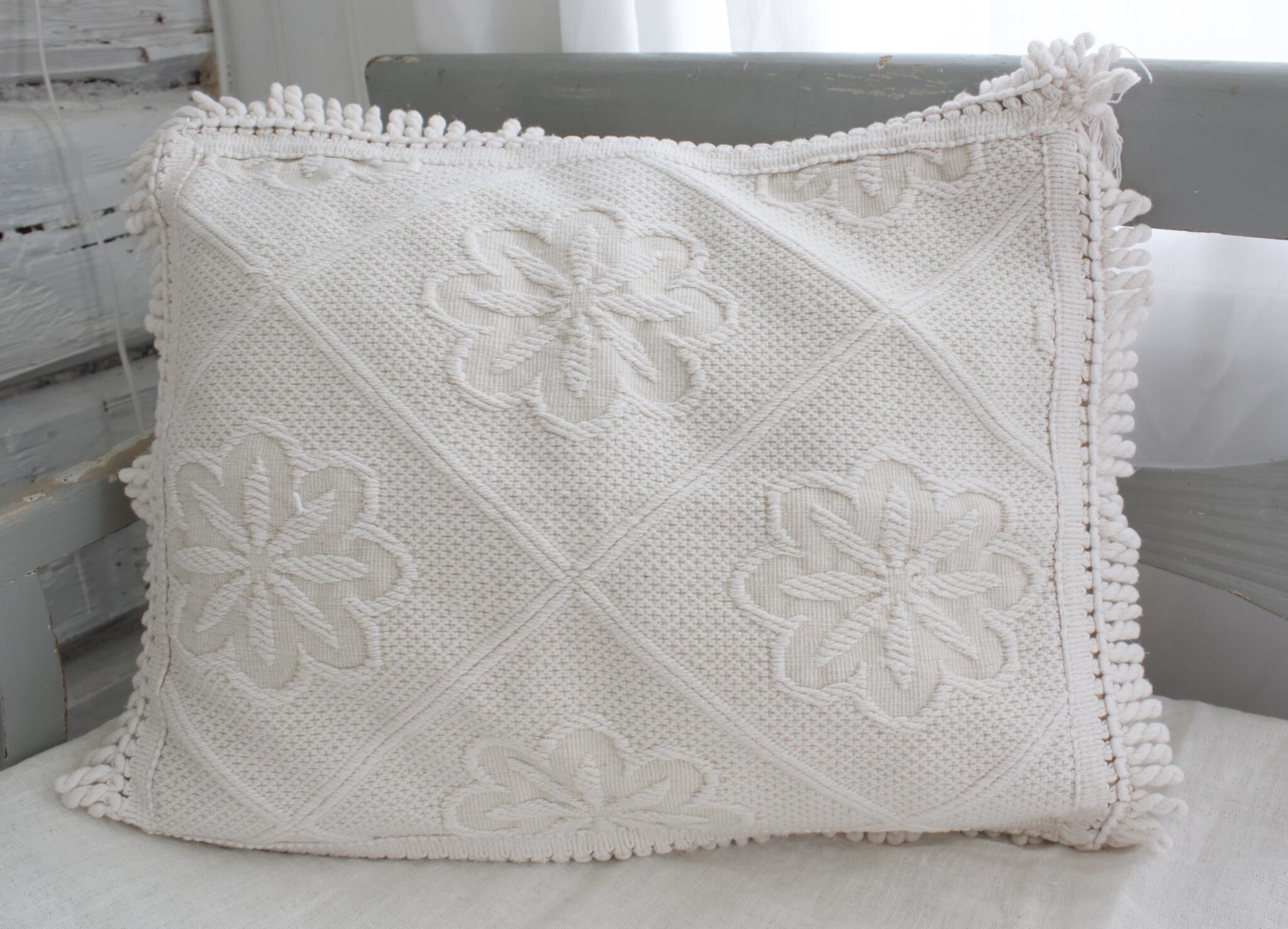 Luonnonvalkoinen tyynynpäällinen, jossa reunassa hapsut.
