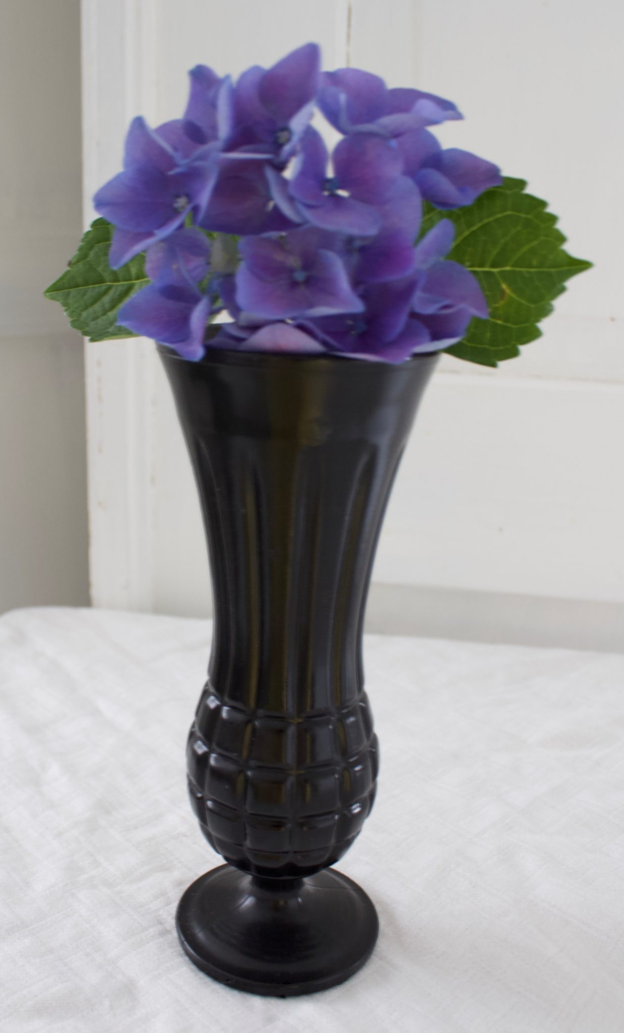 Kauniin mallinen musta jalallinen maljakko,josta maali muutamasta kohdasta nuppineulanpään kokoisesti lähtenyt pois.