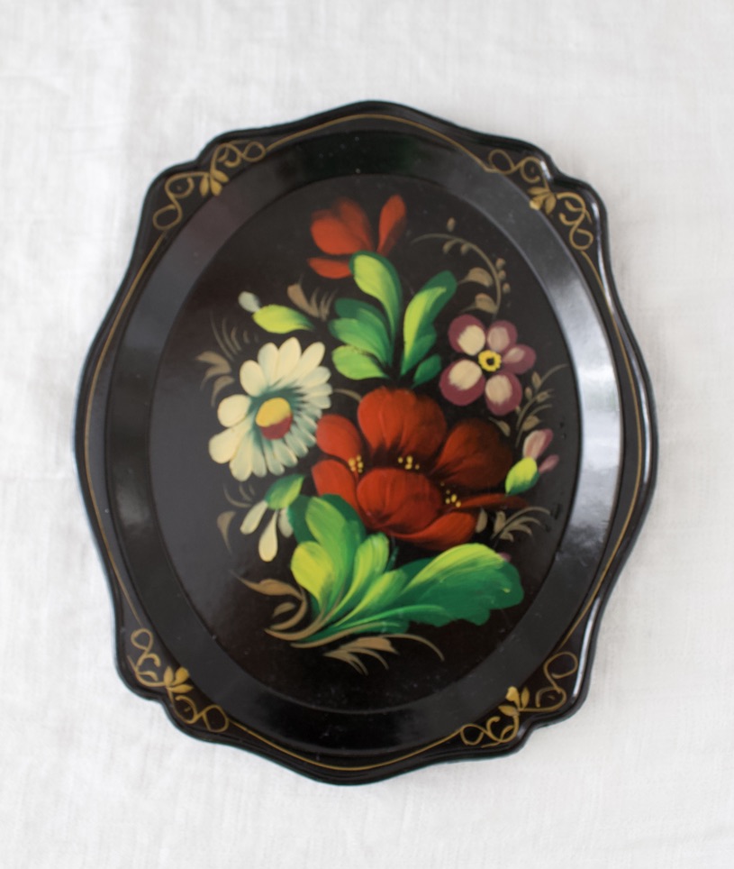 Musta muovinen vintage kukkatarjotin.