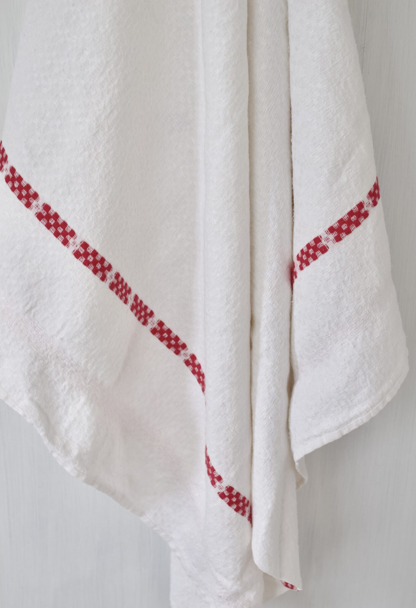 Pellavapyyhe, jossa punaiset raidat päissä.