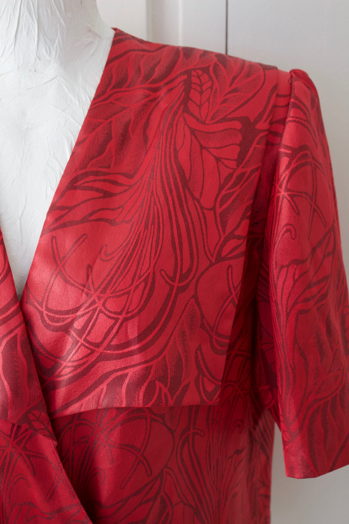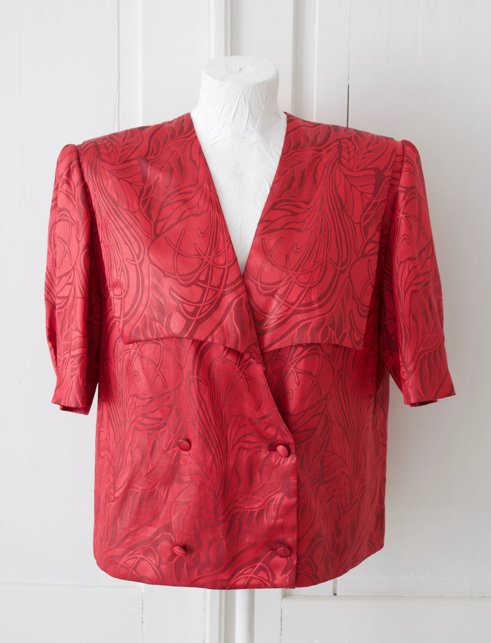 Punainen kiiltäväpintainen vintage paita lyhyillä hihoilla, suurilla kauluksilla ja olkatoppauksilla.