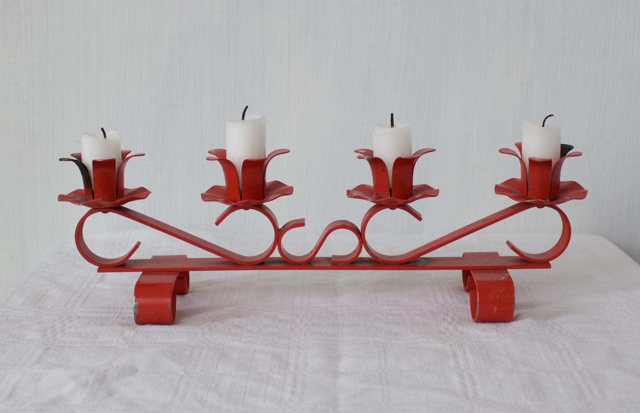 Punainen metallinen kynttelikkö, jossa on neljälle kynttilälle paikka.
