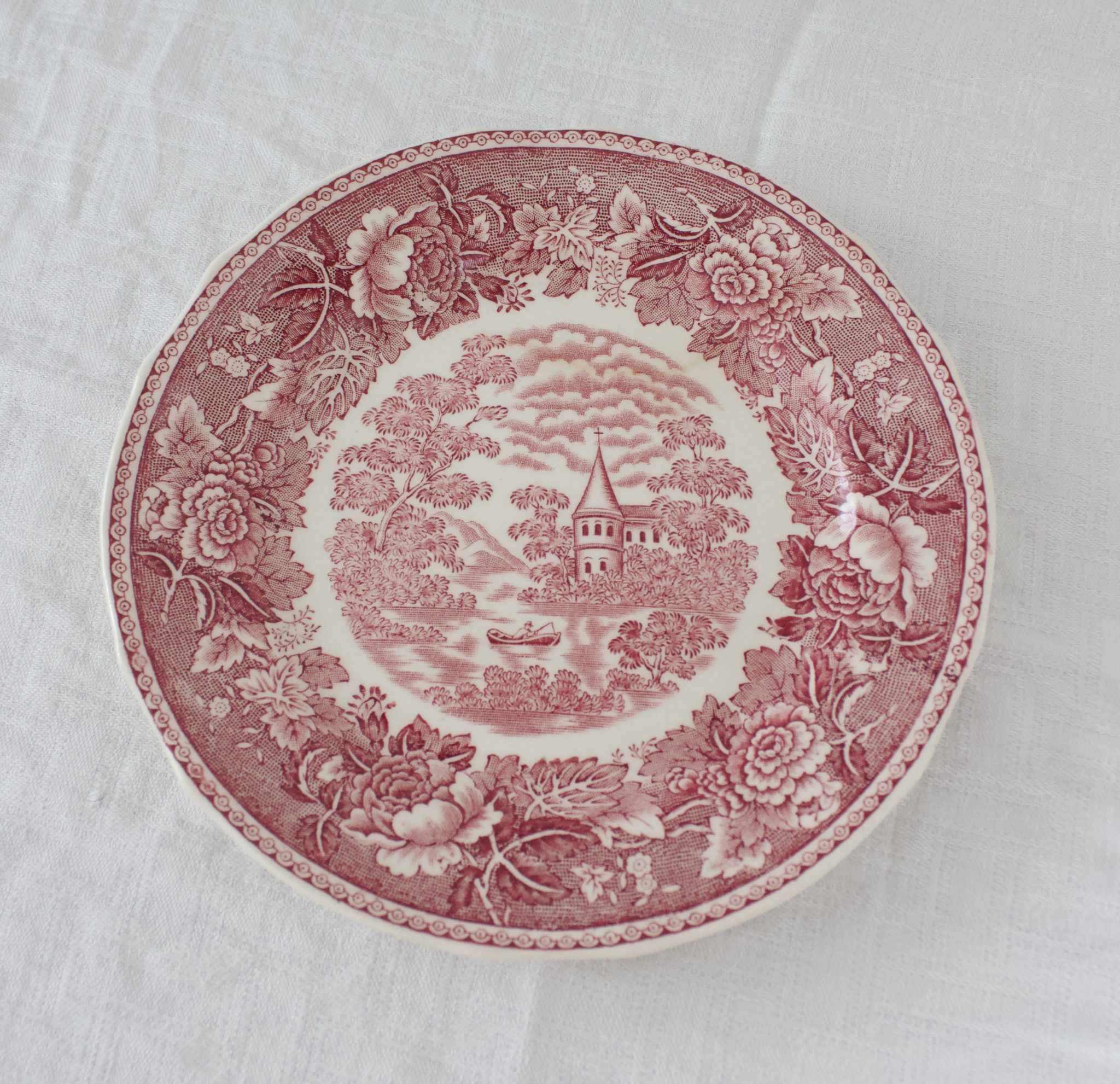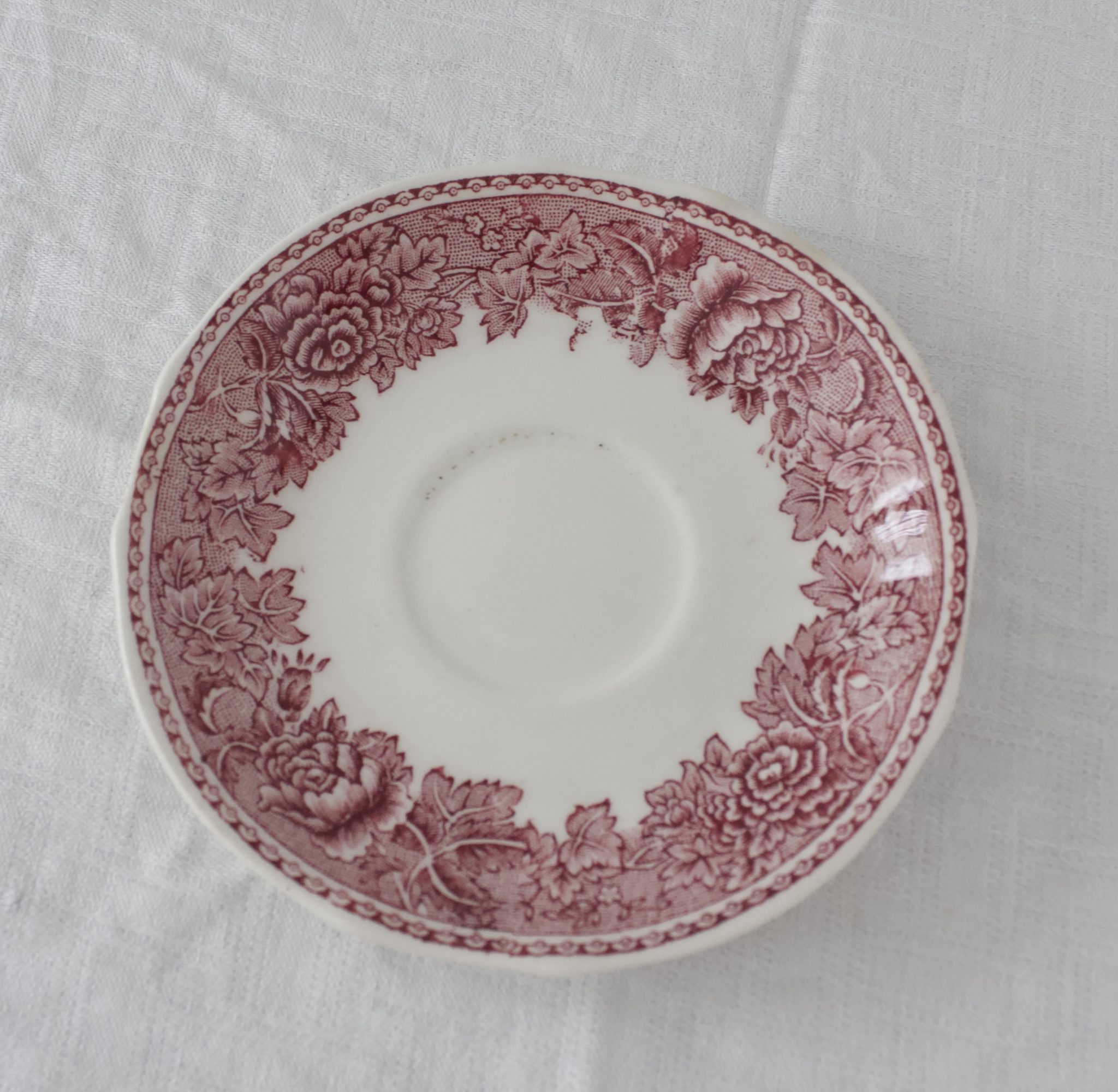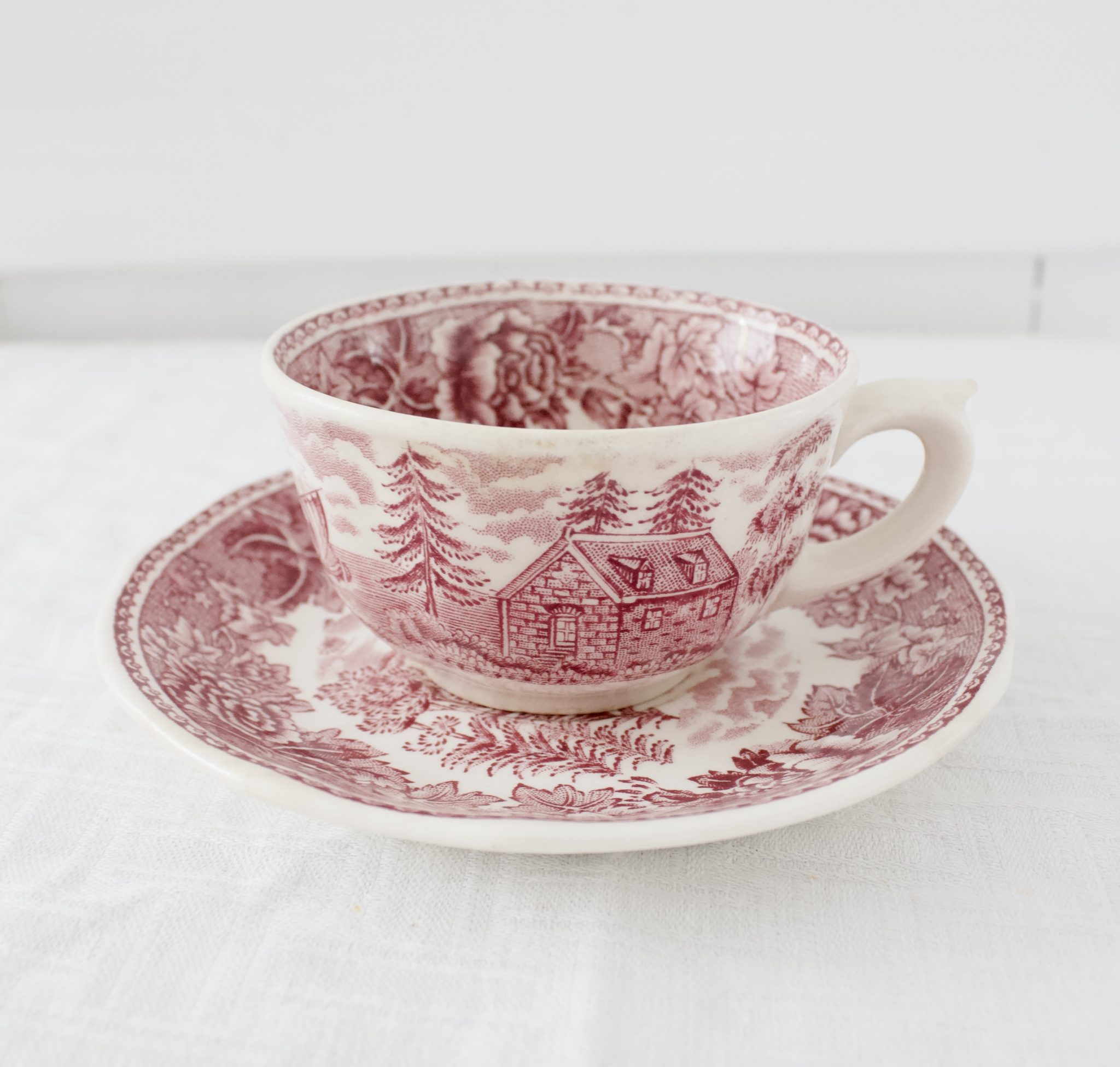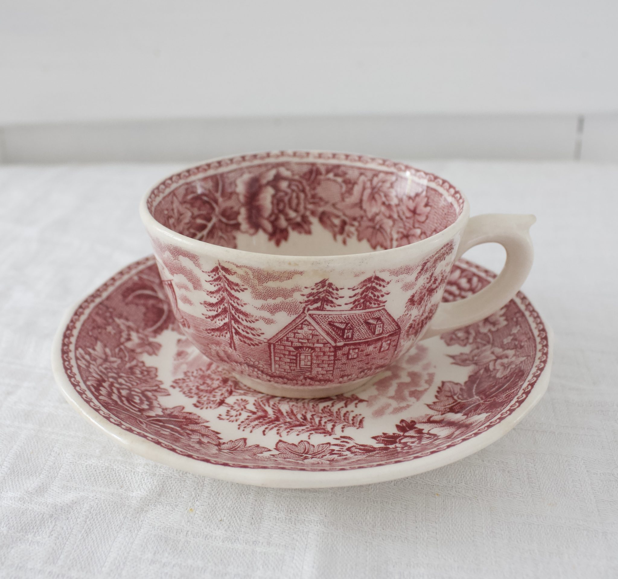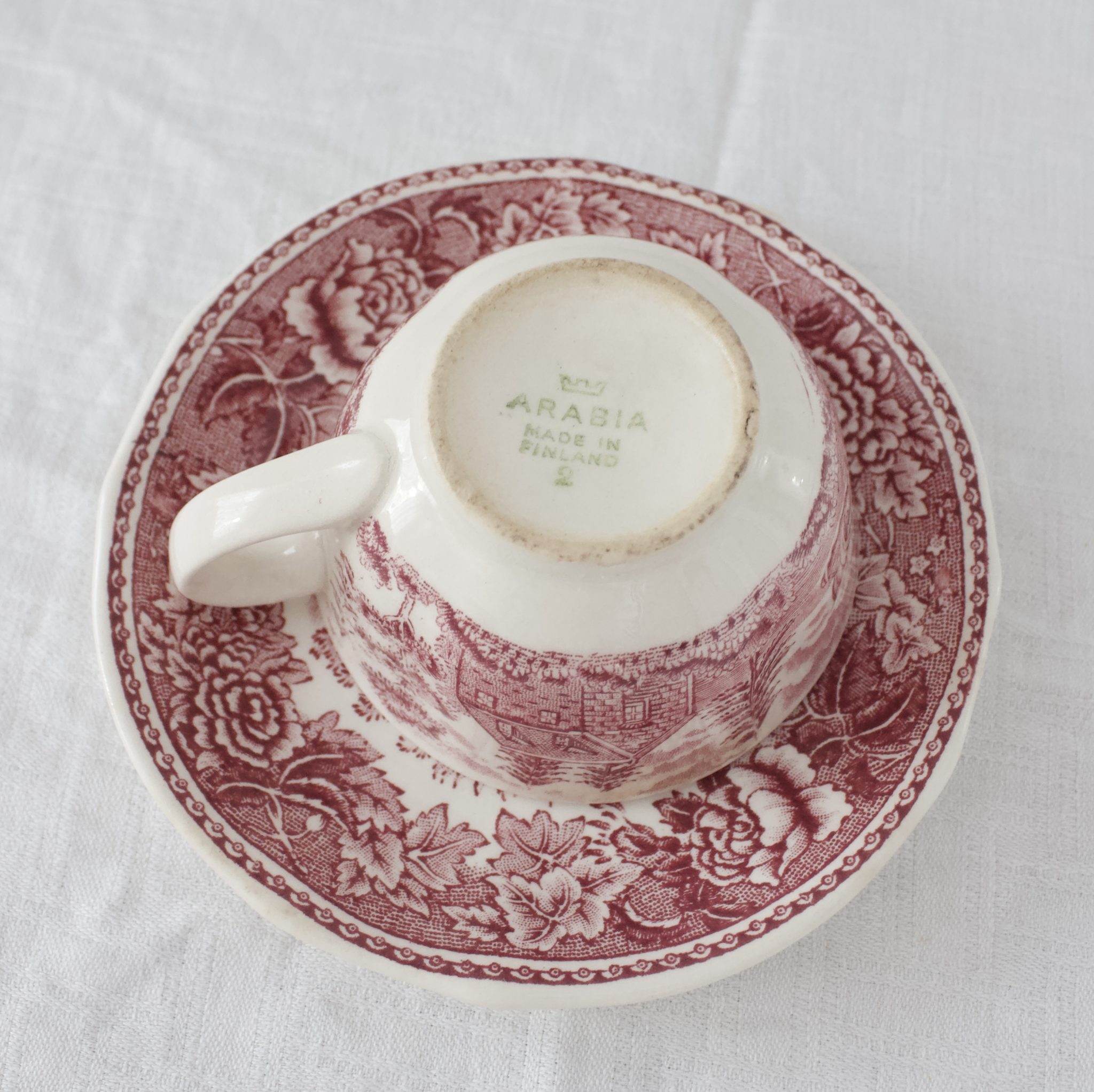 Ihastuttava punainen Arabian maisema kahvikuppi, jossa tassin kuviointi saattaa vaidella. (jossain kokonaan kuvio, jossain keskiosa ilman kuviointia.