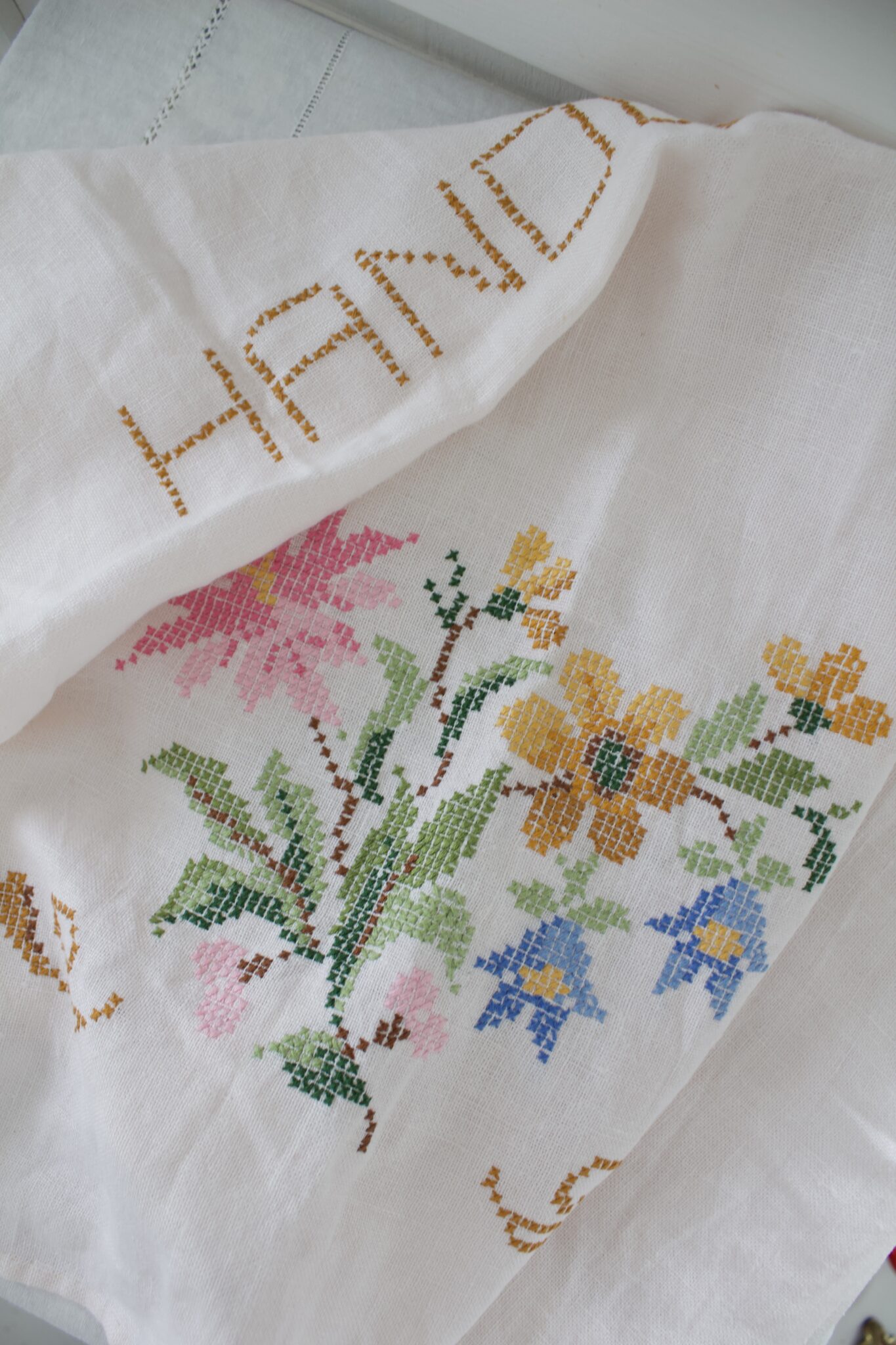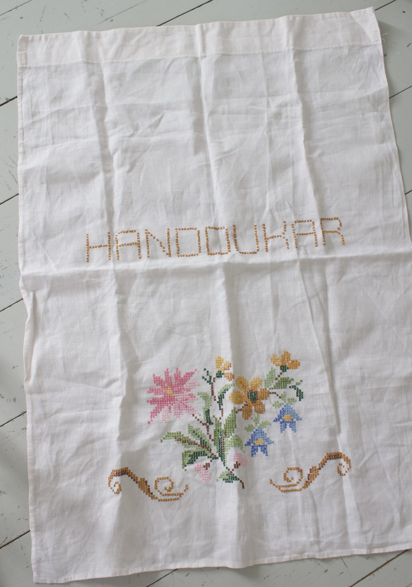 Kaunis pellavakankainen pyyhetelineen liina, jossa upea kaunis kukkakirjailu ja teksti handdukar.