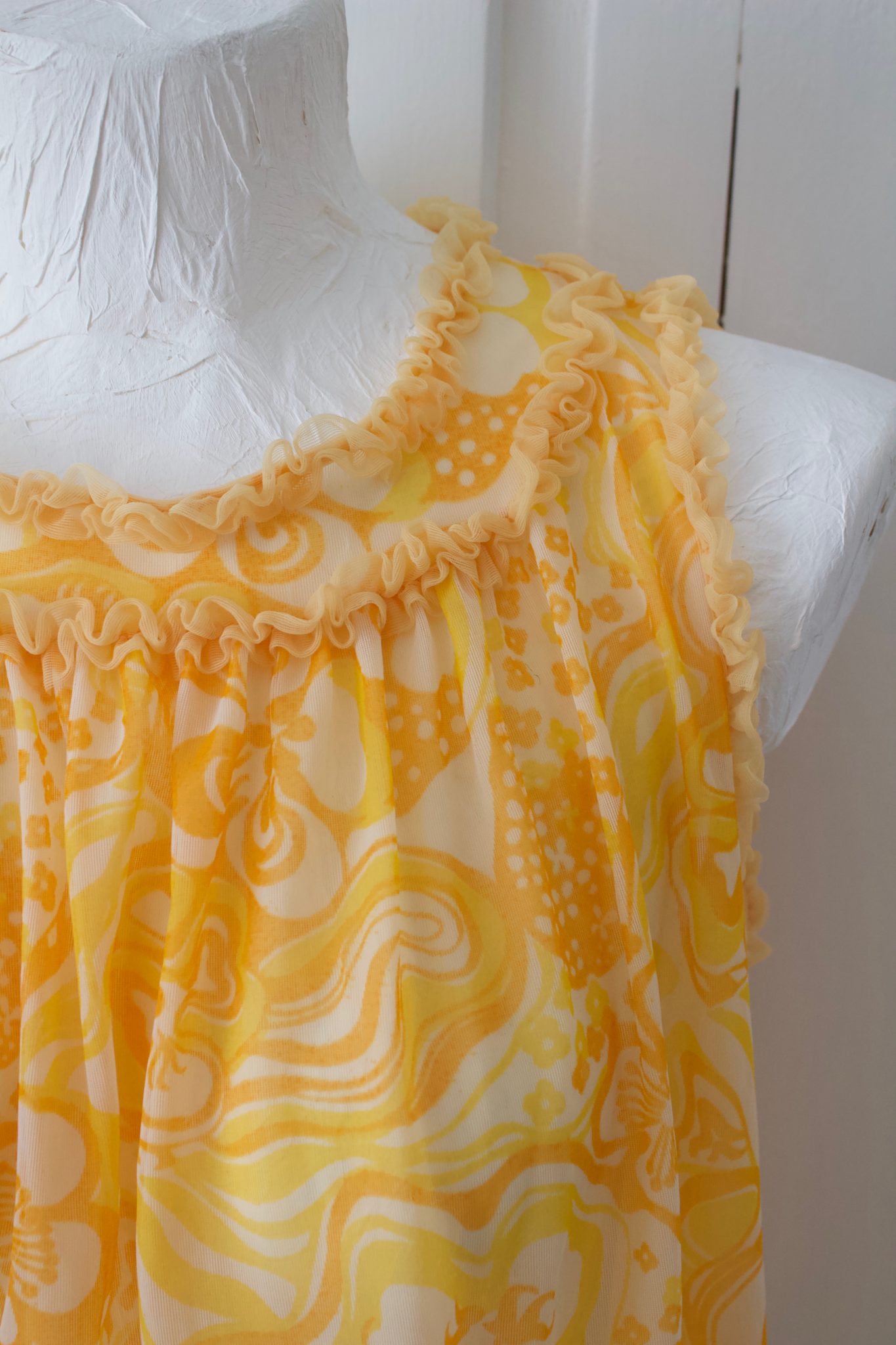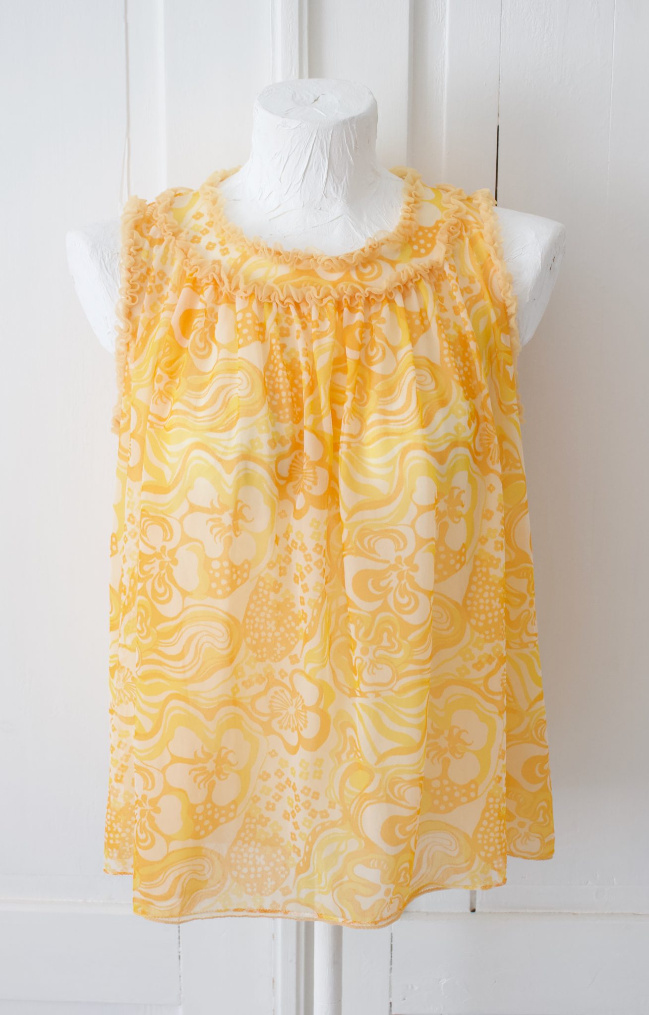 Hihaton kelta oranssi kuviollinen keinokuituinen reto paita. Hieman alaspäin levenevä helma.