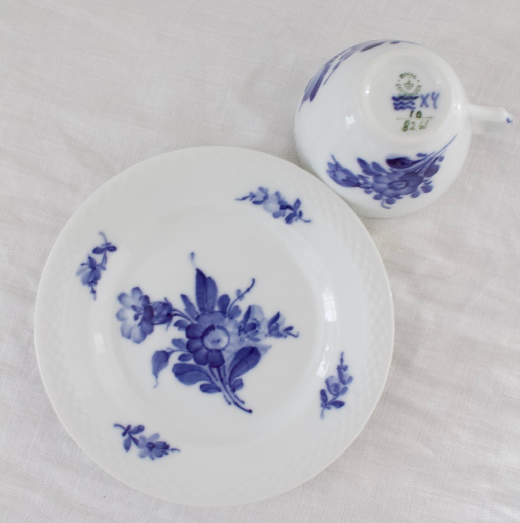 Royal Copenhagen Blue flower kuppisetti, jossa kahvikuppi ja pullalautanen.