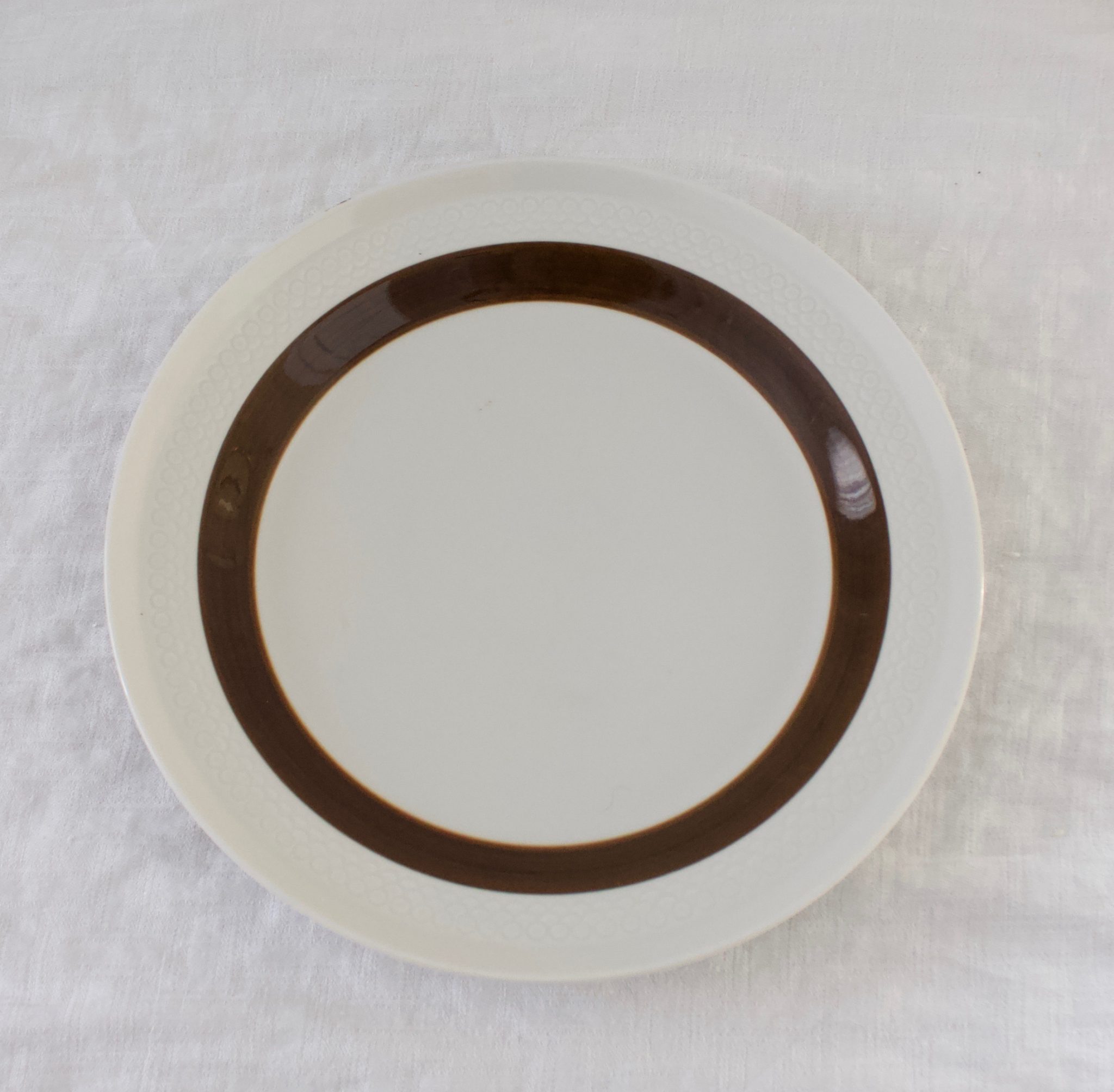 Ruotsalainen valkoinen posliininen ruokalautanen, jossa ruskea raita reunalla.