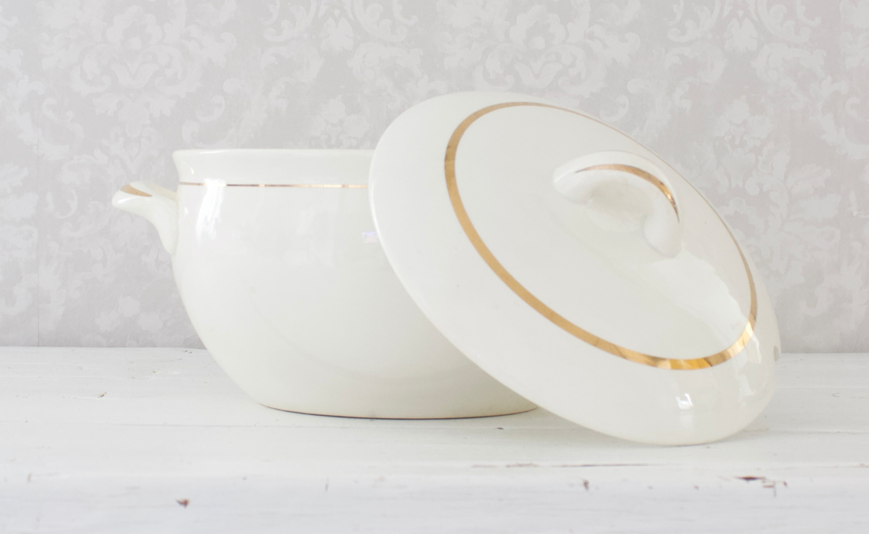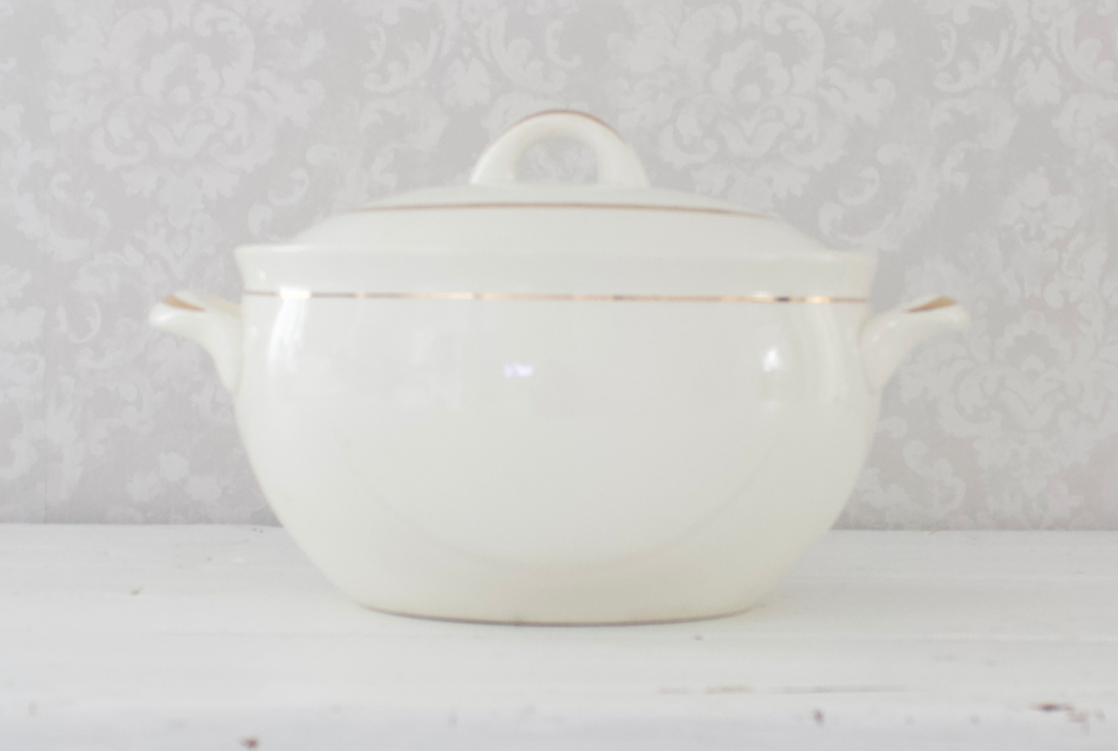 Vanha ulkolainen valkoinen täysin ehjä soppakulho kannella, jossa kultaiset koristeet. Halkaisija n 23 cm. ja korkeus kannen kanssa noin 17 cm.