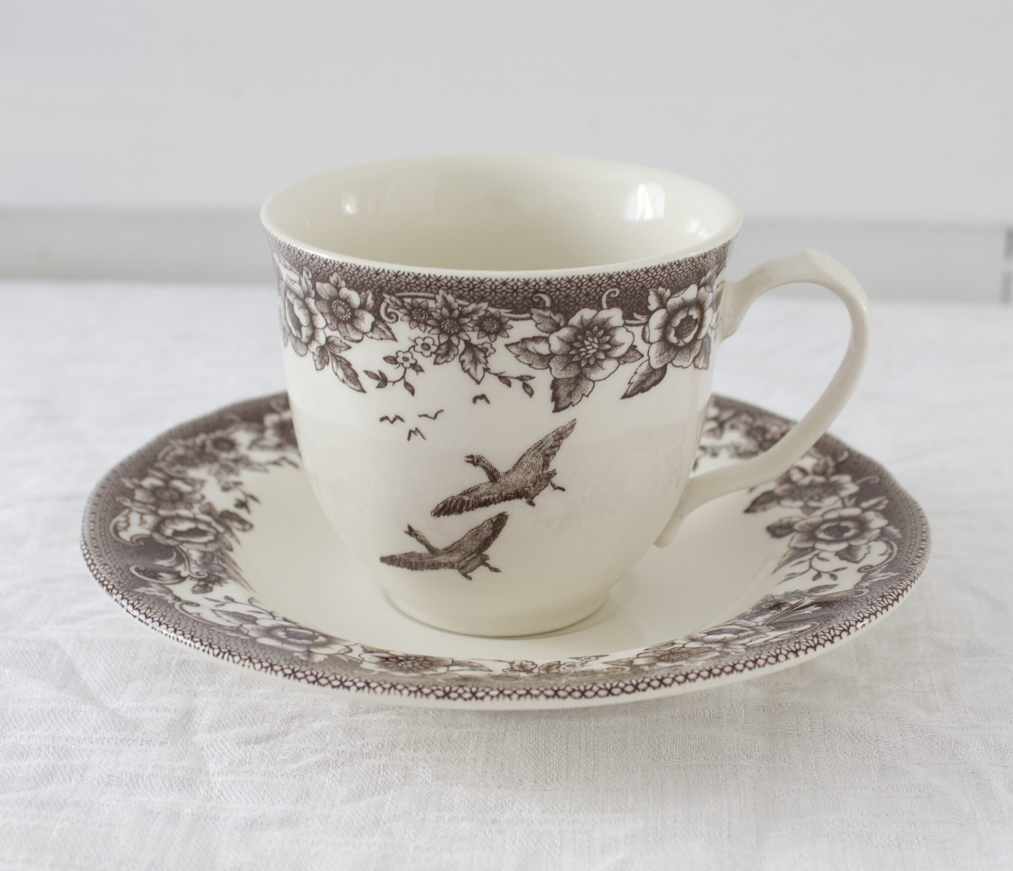 Ruskea kuvioinen kahvikuppi aluslautasella.