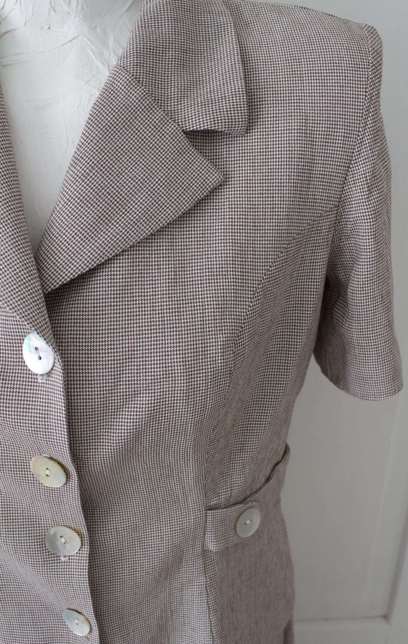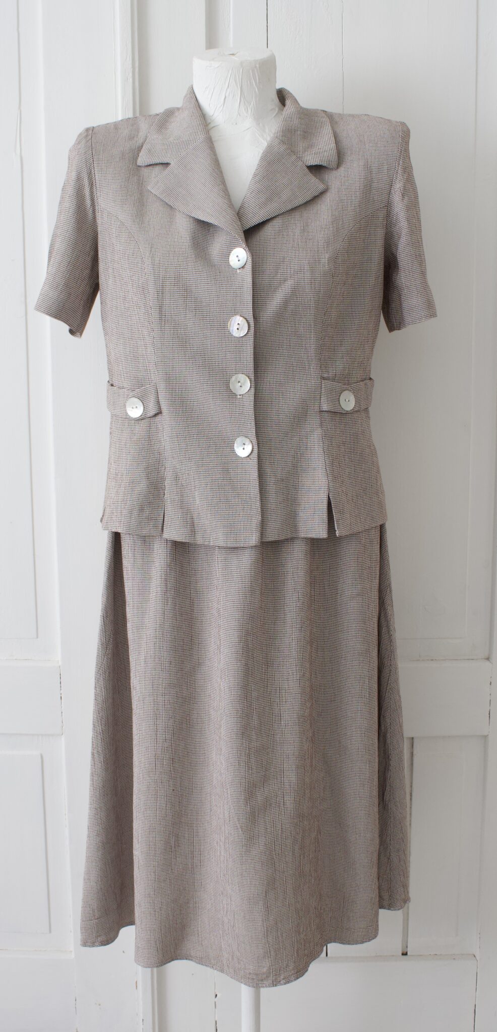 Kaunis ruskea valkoinen vintage asu, jossa jakku ja hame.