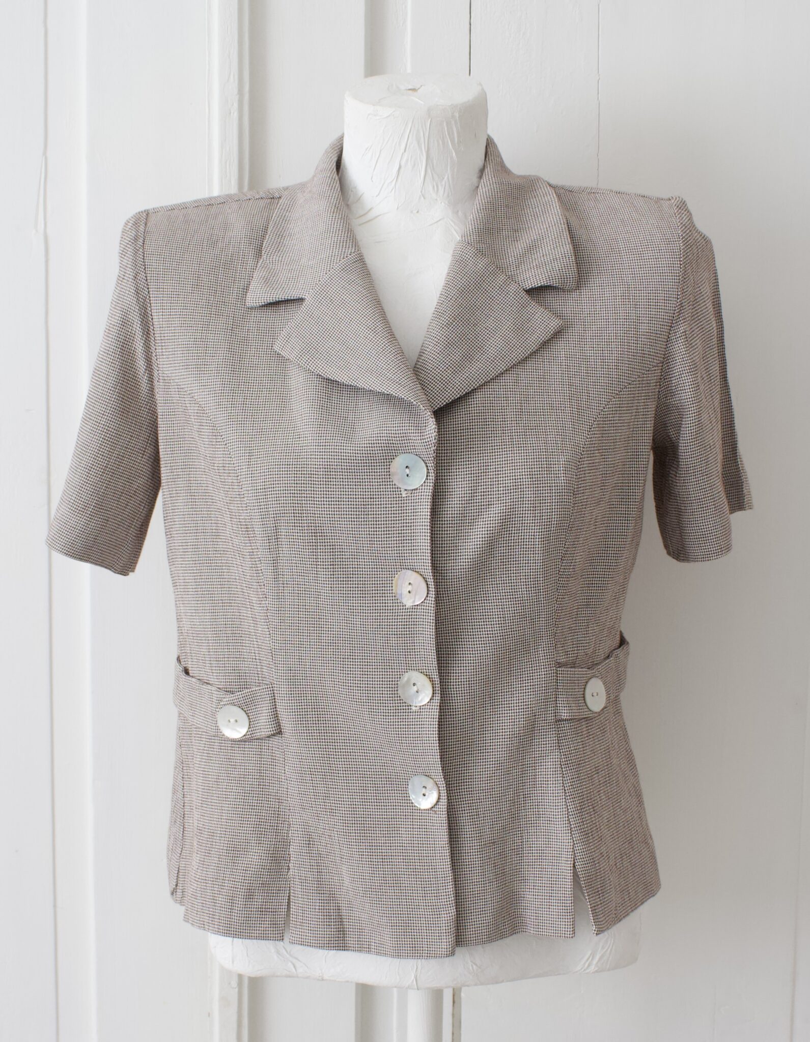 Jakku on tyköistuva, edessä helmiäisnapit, olkatoppaukset.