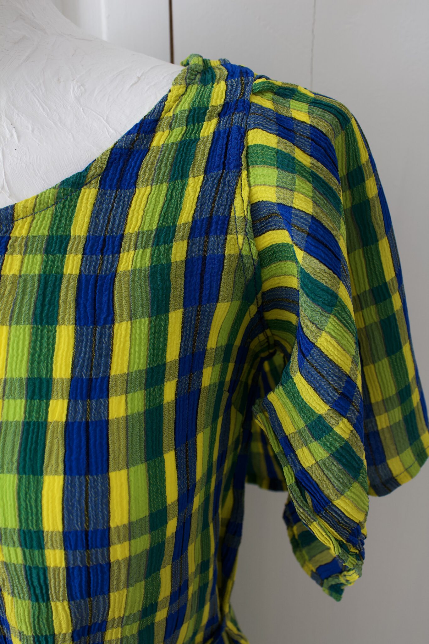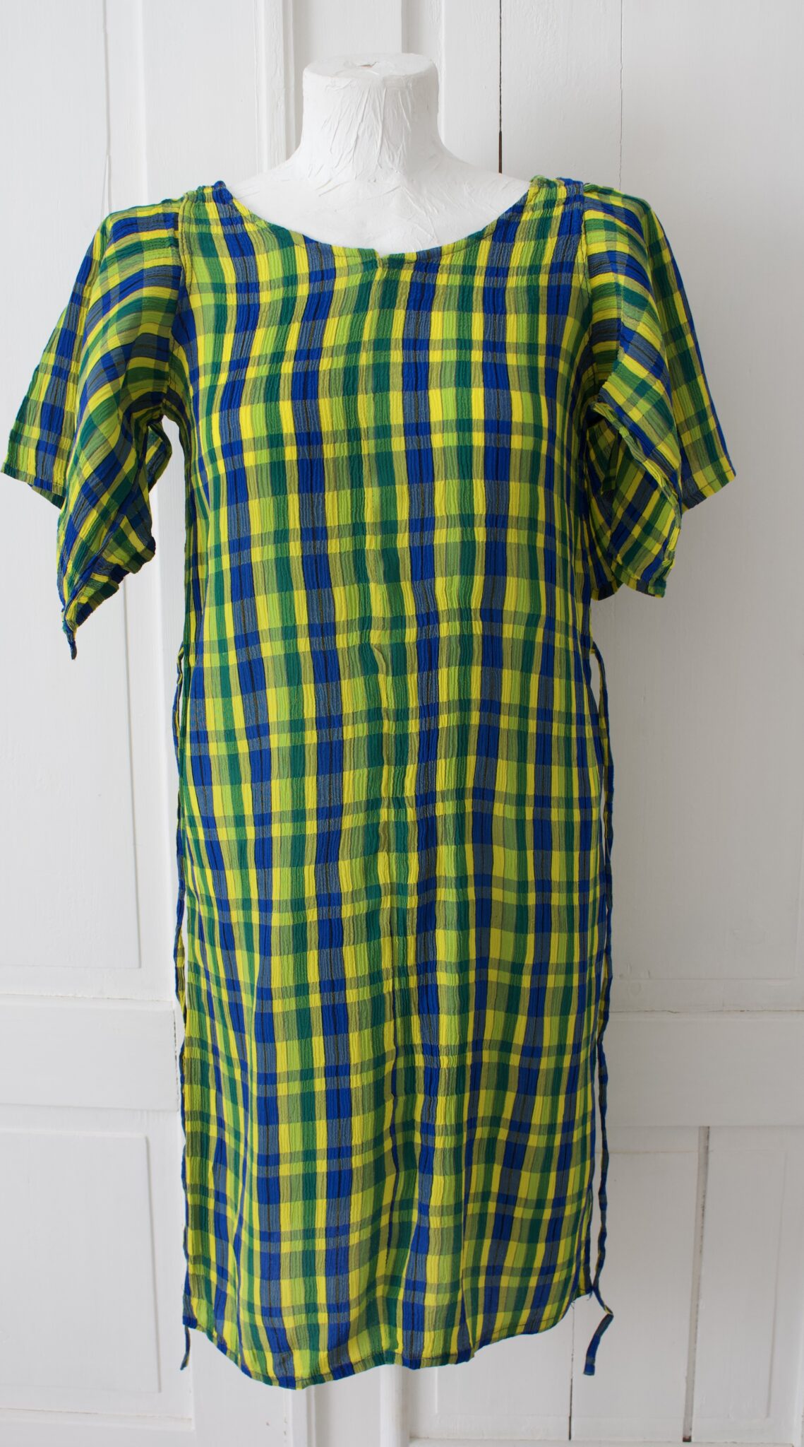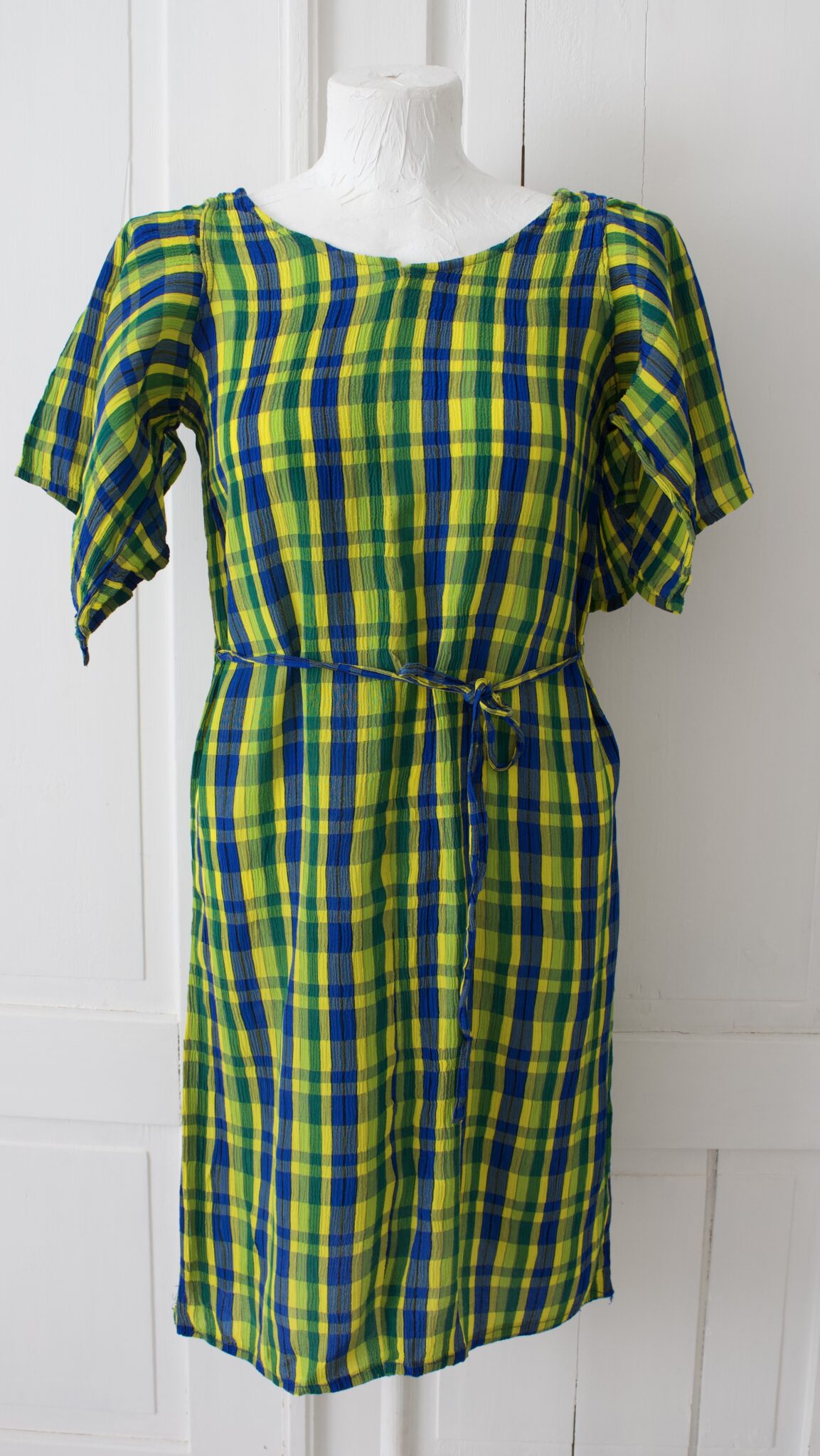 Sini kelta vihreö ruudullinen vintage mekko, hihoilla, jossa alapuoli aukinainen. Vyötäröllä nauha.