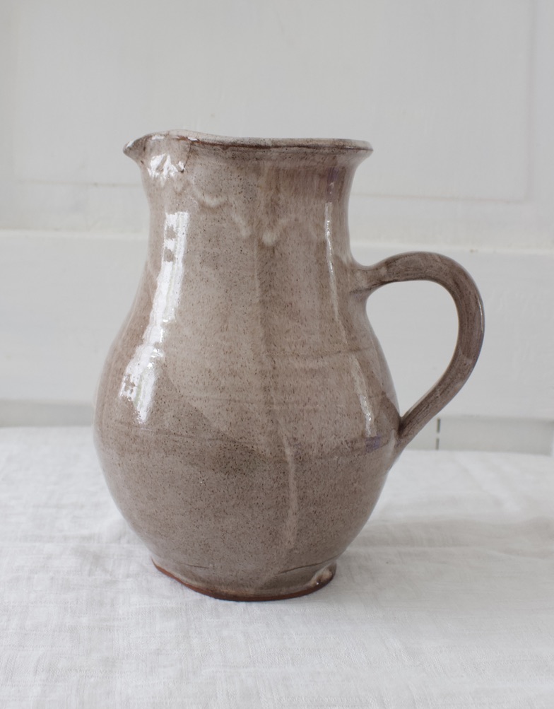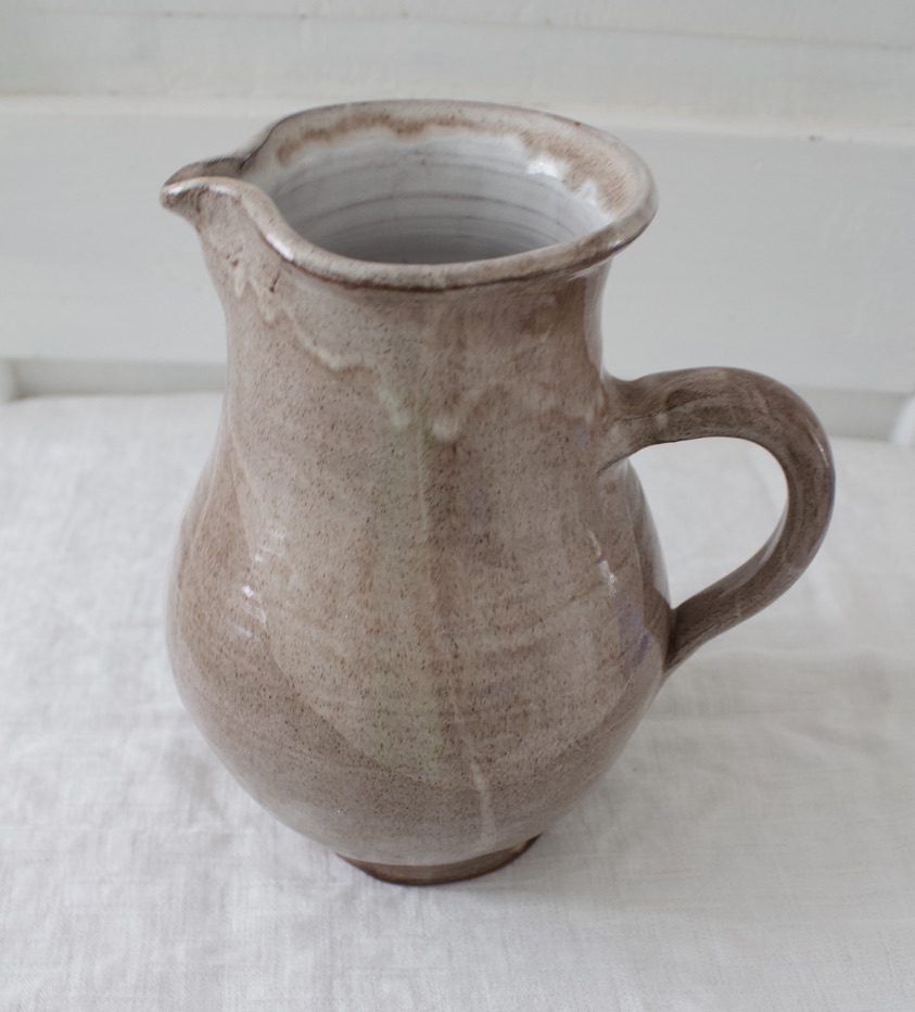 Kaunis vaalean beigelasitettu savikannu.