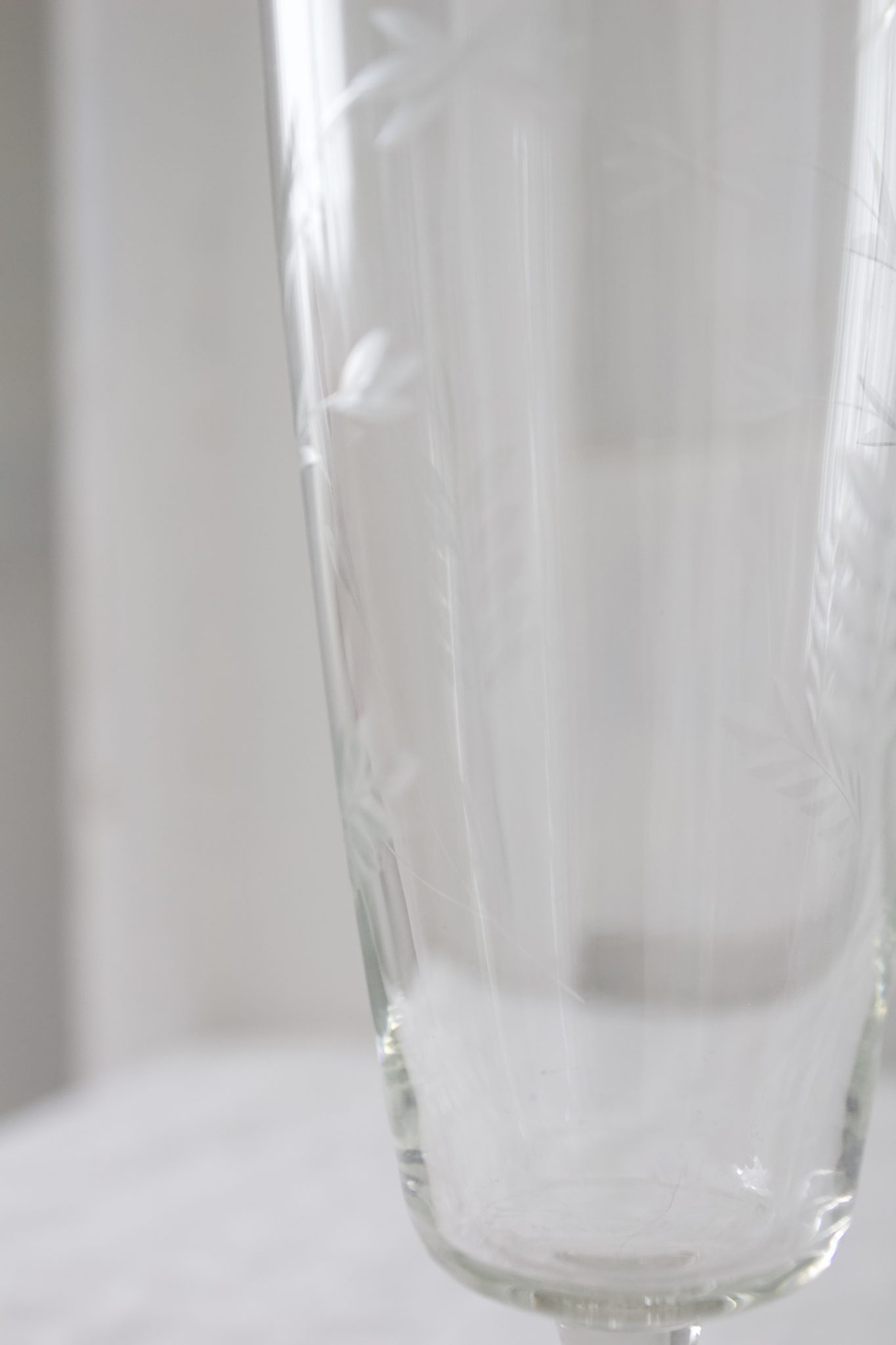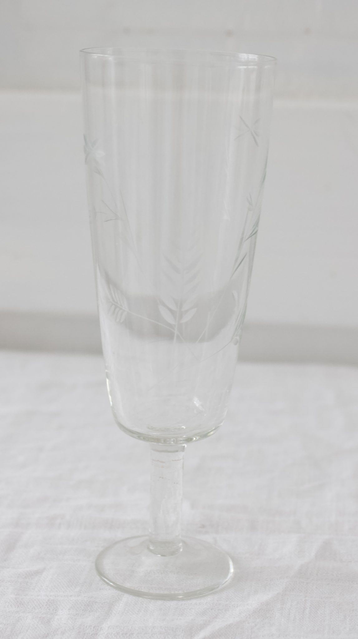 Venäläinen shampanjalasi, jossa kaunis lehtimäinen kaiverrus.