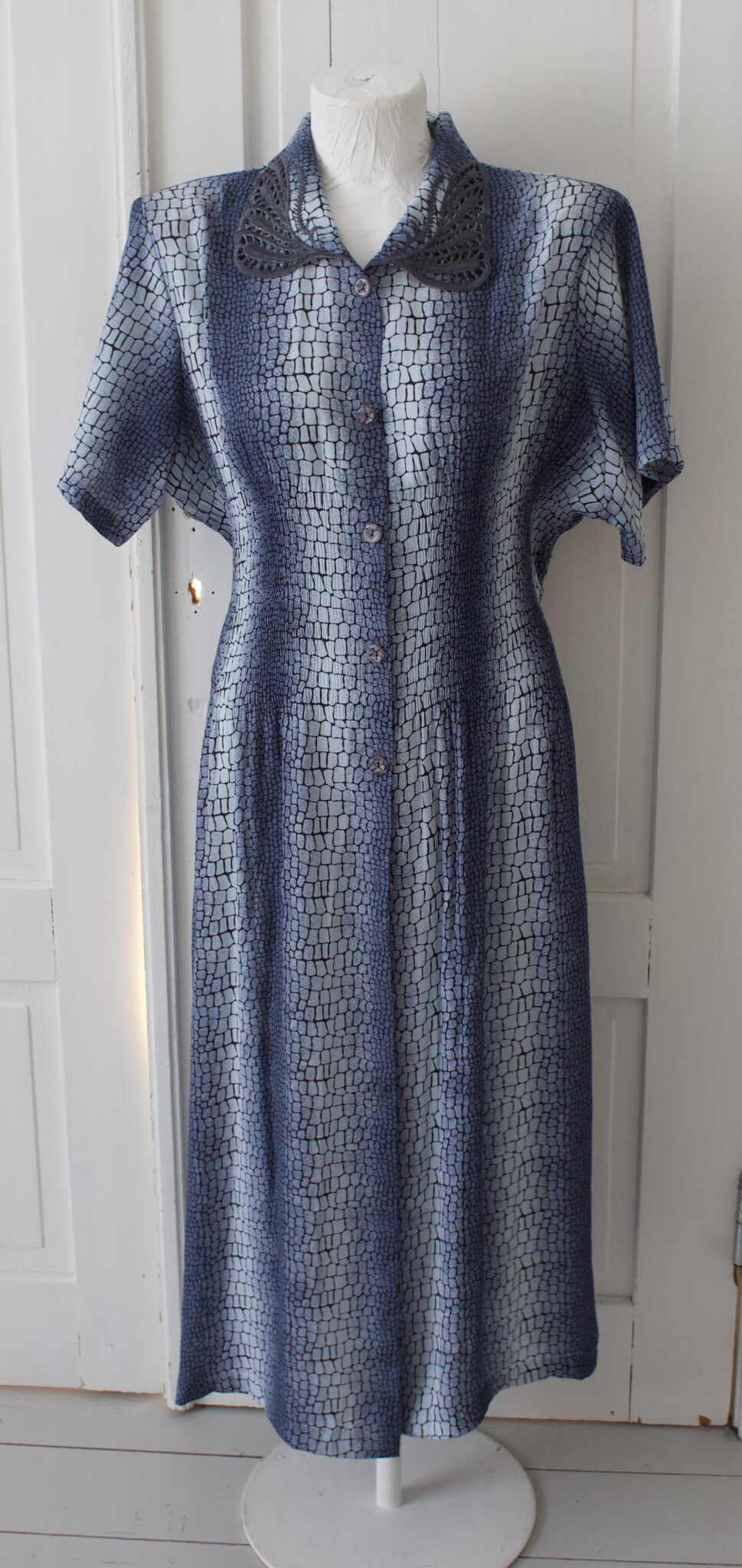 Kaunis sinikuviollinen pitkä vintagemekko, jossa joustava vyötärö, edessä napitus ja takana solmittava nauha.