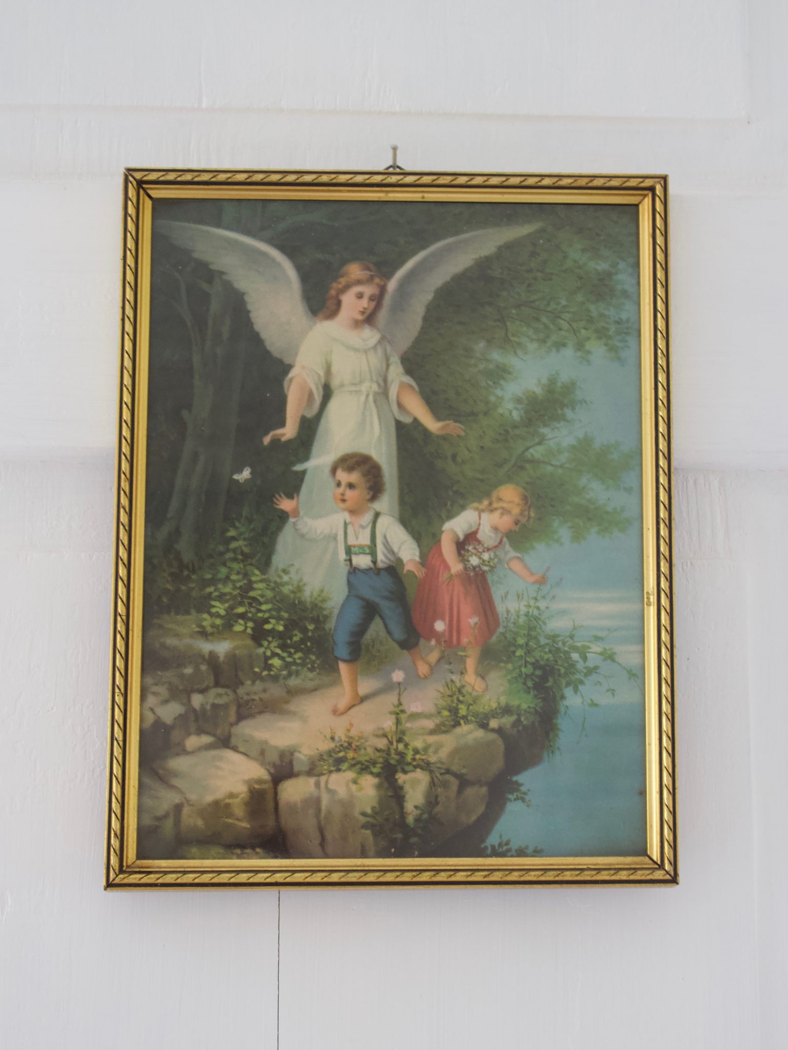 Aivan ihastuttava vanha suojelusenkeli taulu, jossa kultaiset kehykset ja lasipäällä. Takana pieni ripustuslenkki.