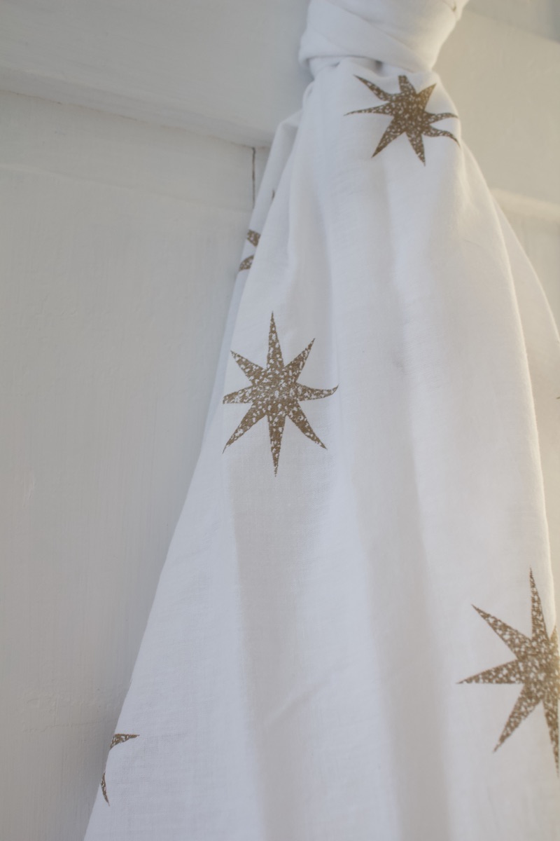 Valkoinen harsomainen verho/ kangas, jossa kullan sävyinen tähtikuvio.