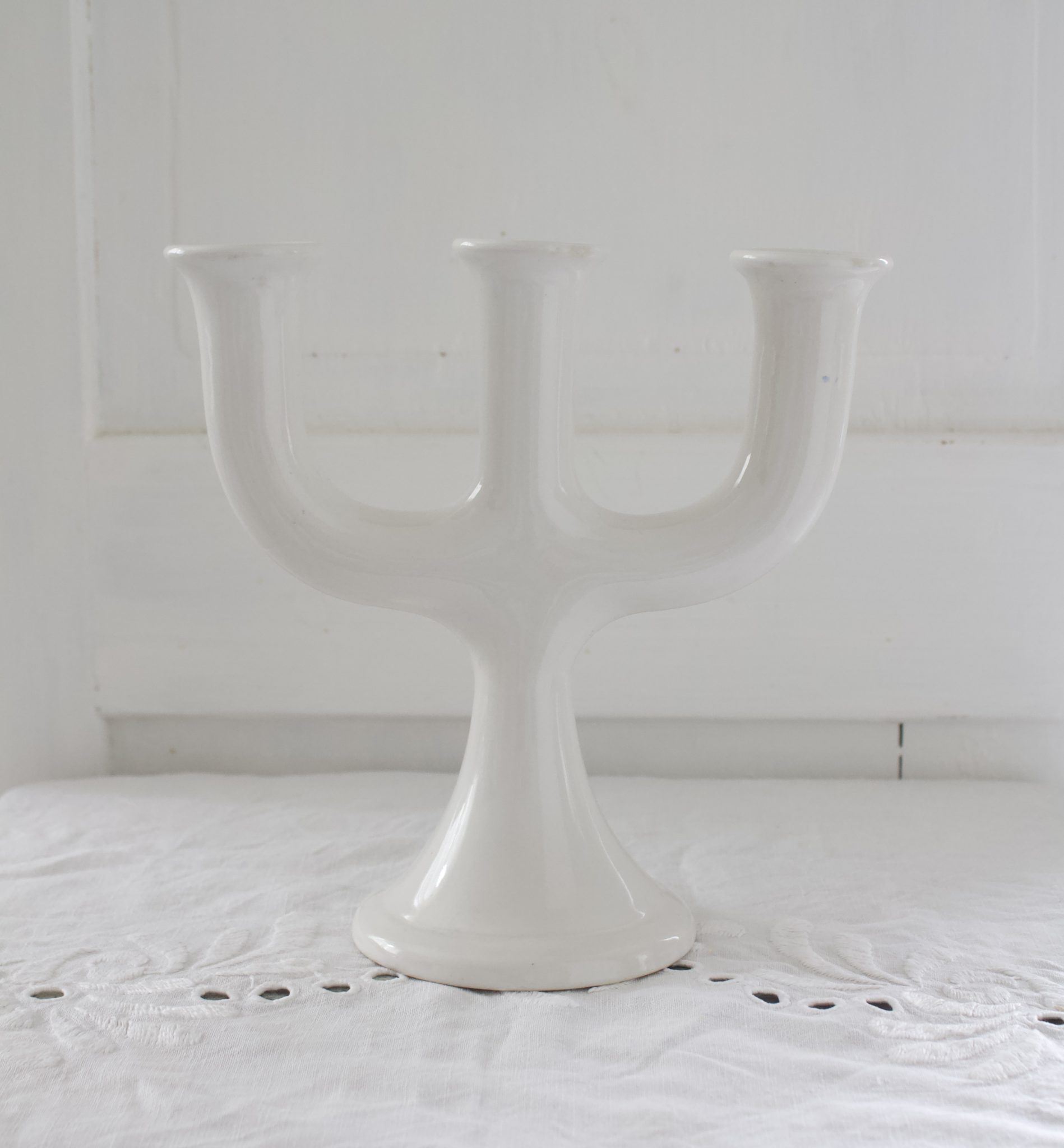 Valkoinen posliininen kolmihaarainen kynttilänjalka.