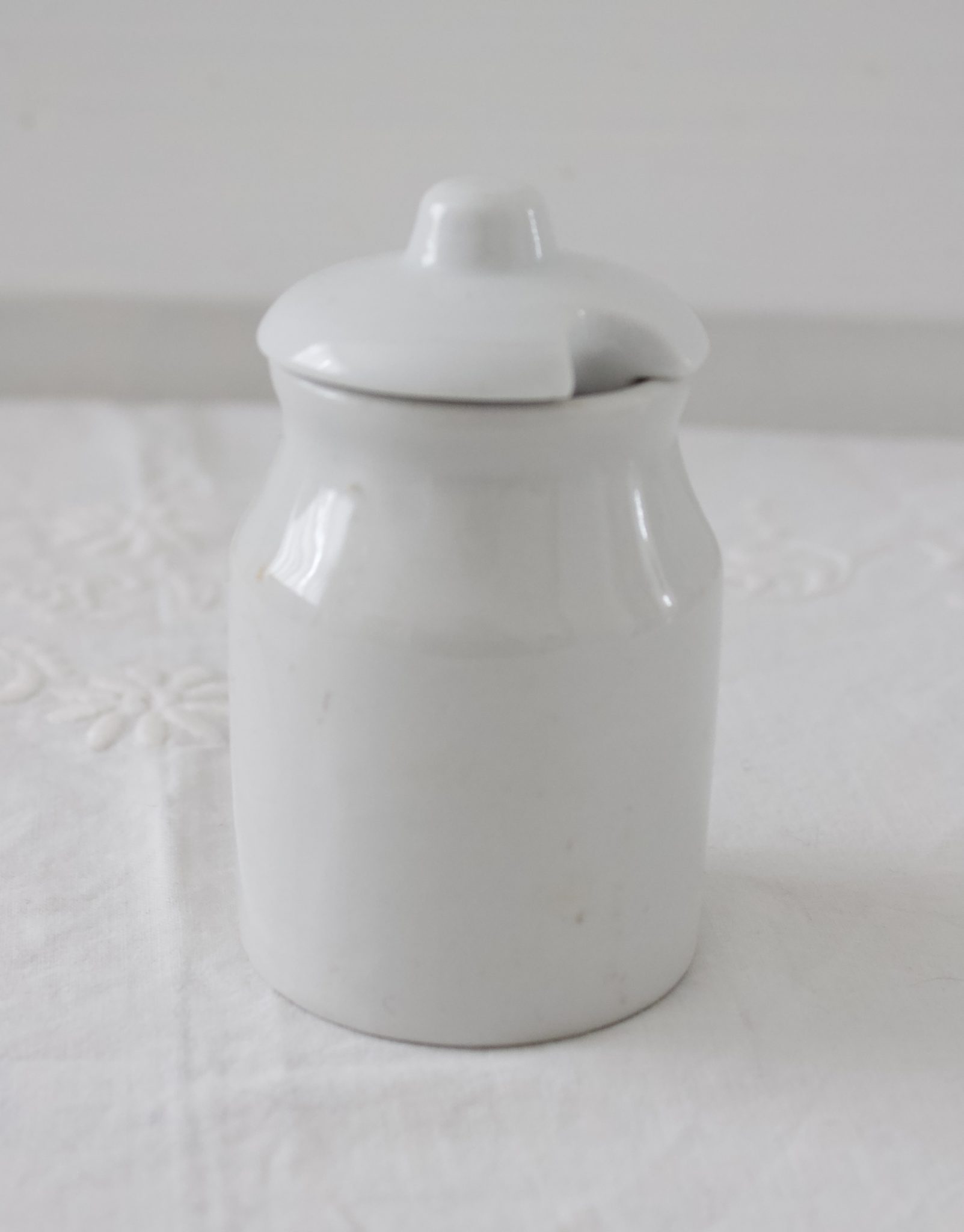 Vanha valkoinen posliininen sinappipurkki, jossa kolo lusikalle.