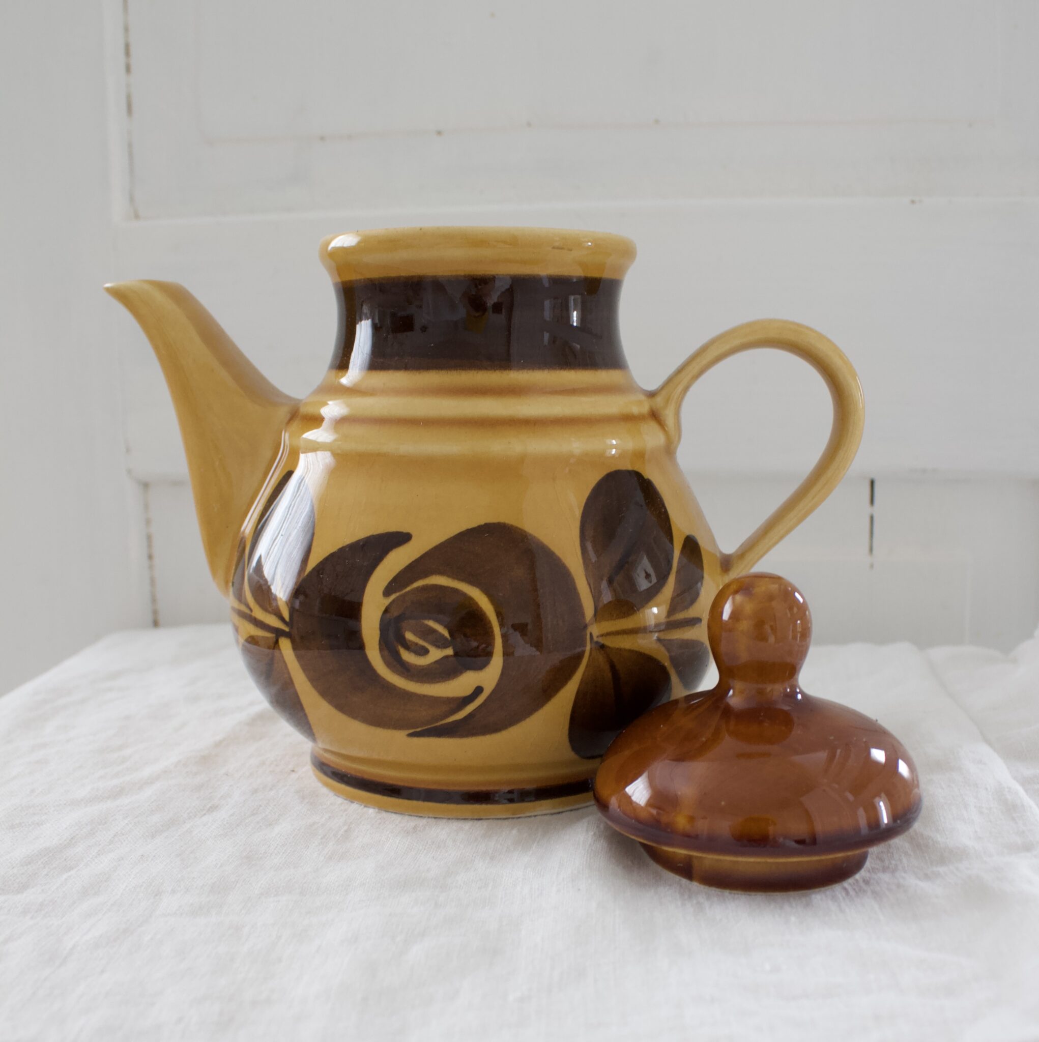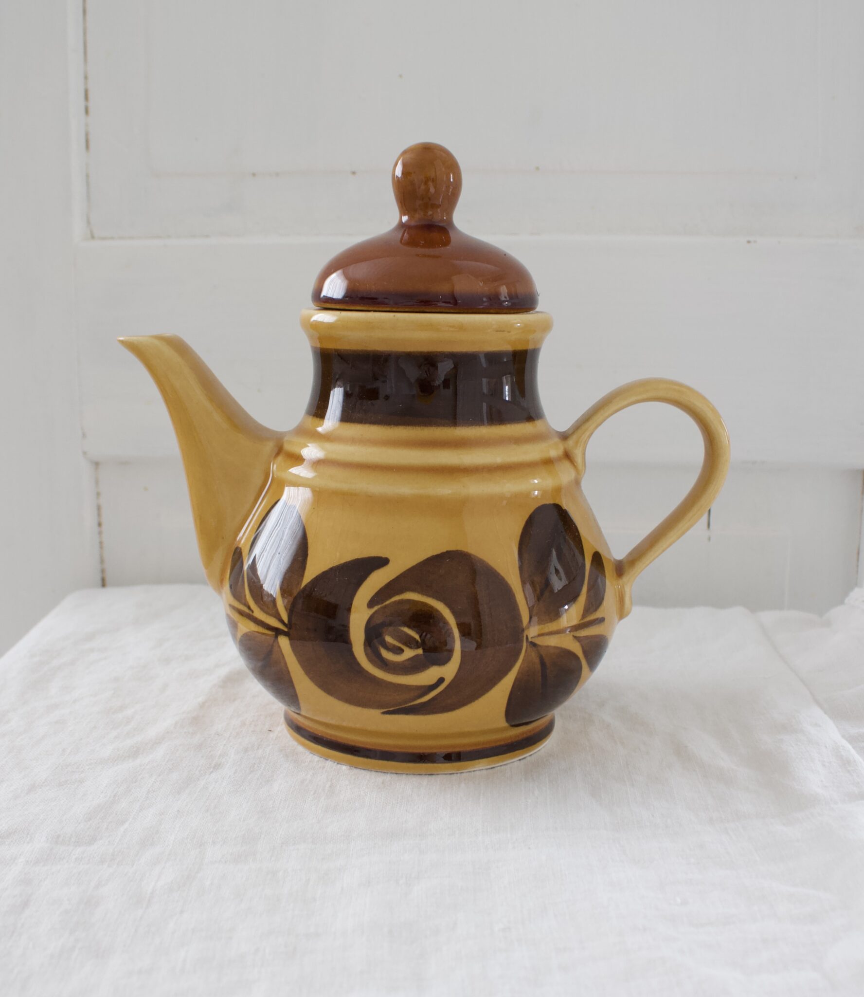Vanha ruskea retro kahvi-/teekannu kannella.