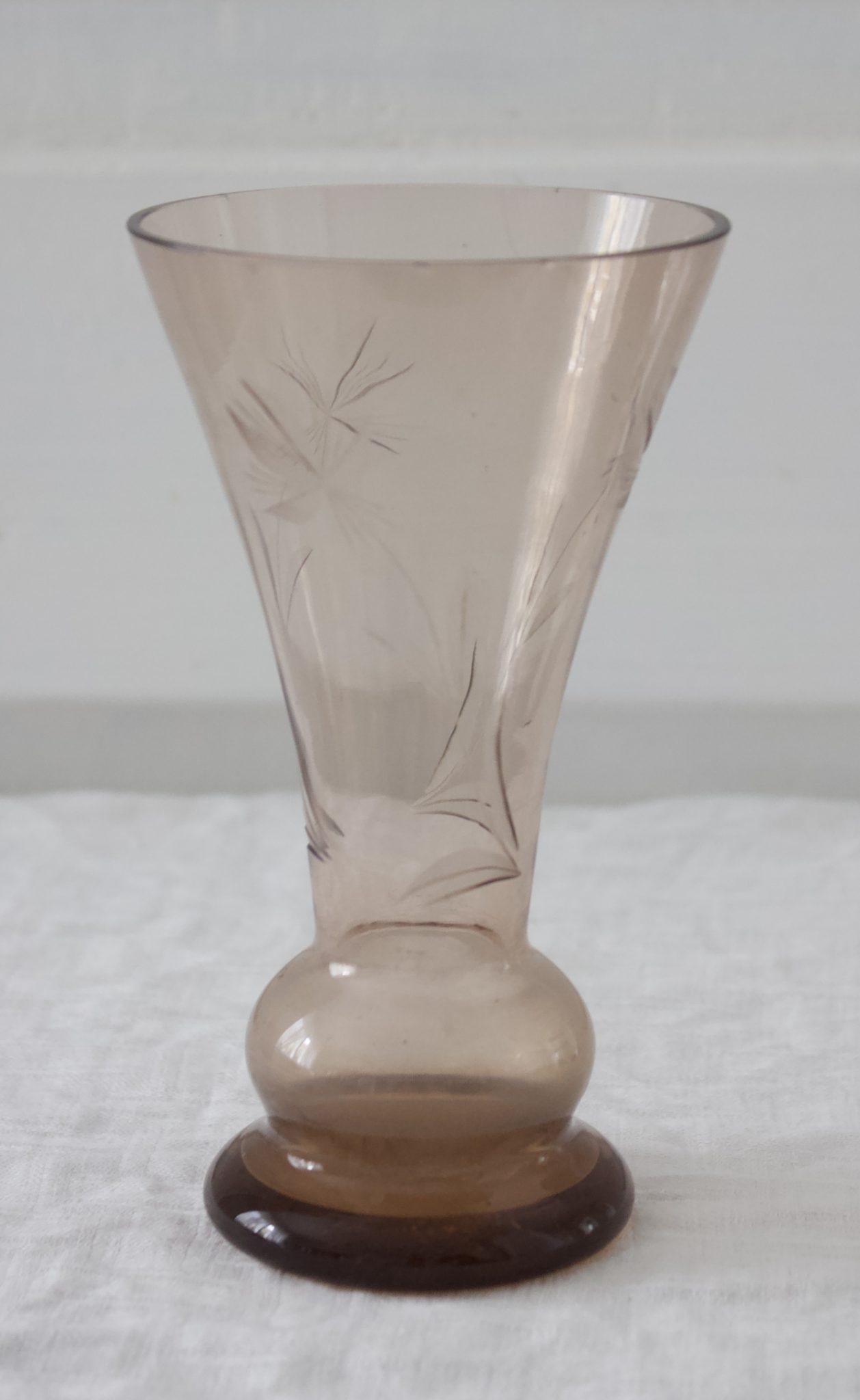 Vanha ohut lasinen ruskea maljakko, jossa kaunis koriste hionta.