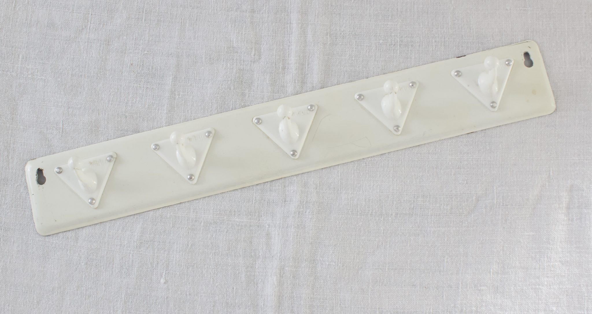 Vanha valkoinen metallinaulakko, joss 5 kpl muovisia koukkuja.