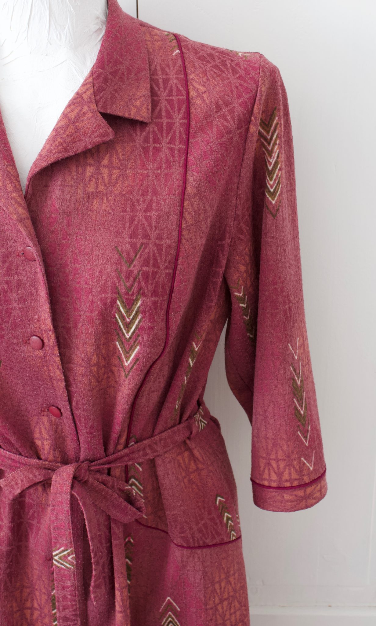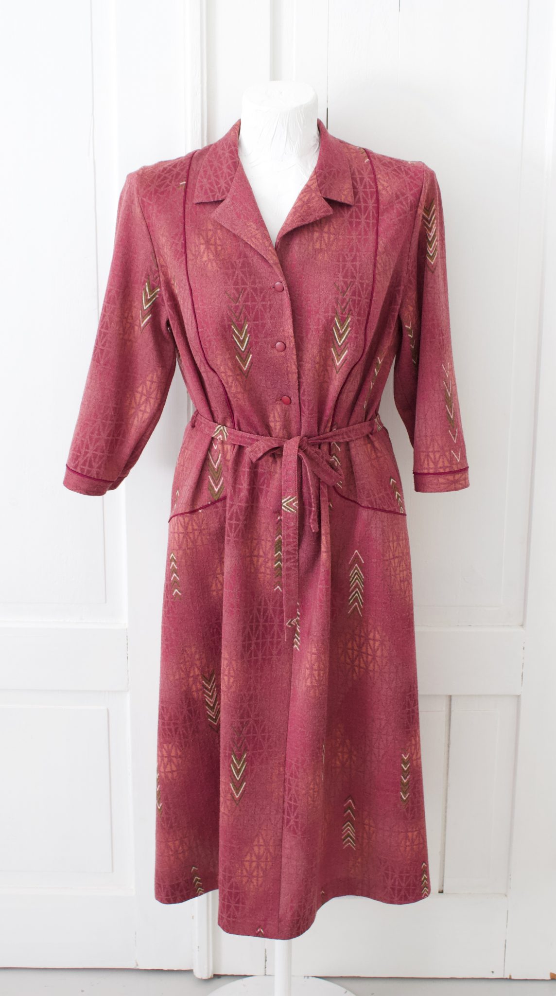 Viininpunainen pitkähihainen vintage mekko, jossa edessä napit ja vyötäröllä solmittava vyö.