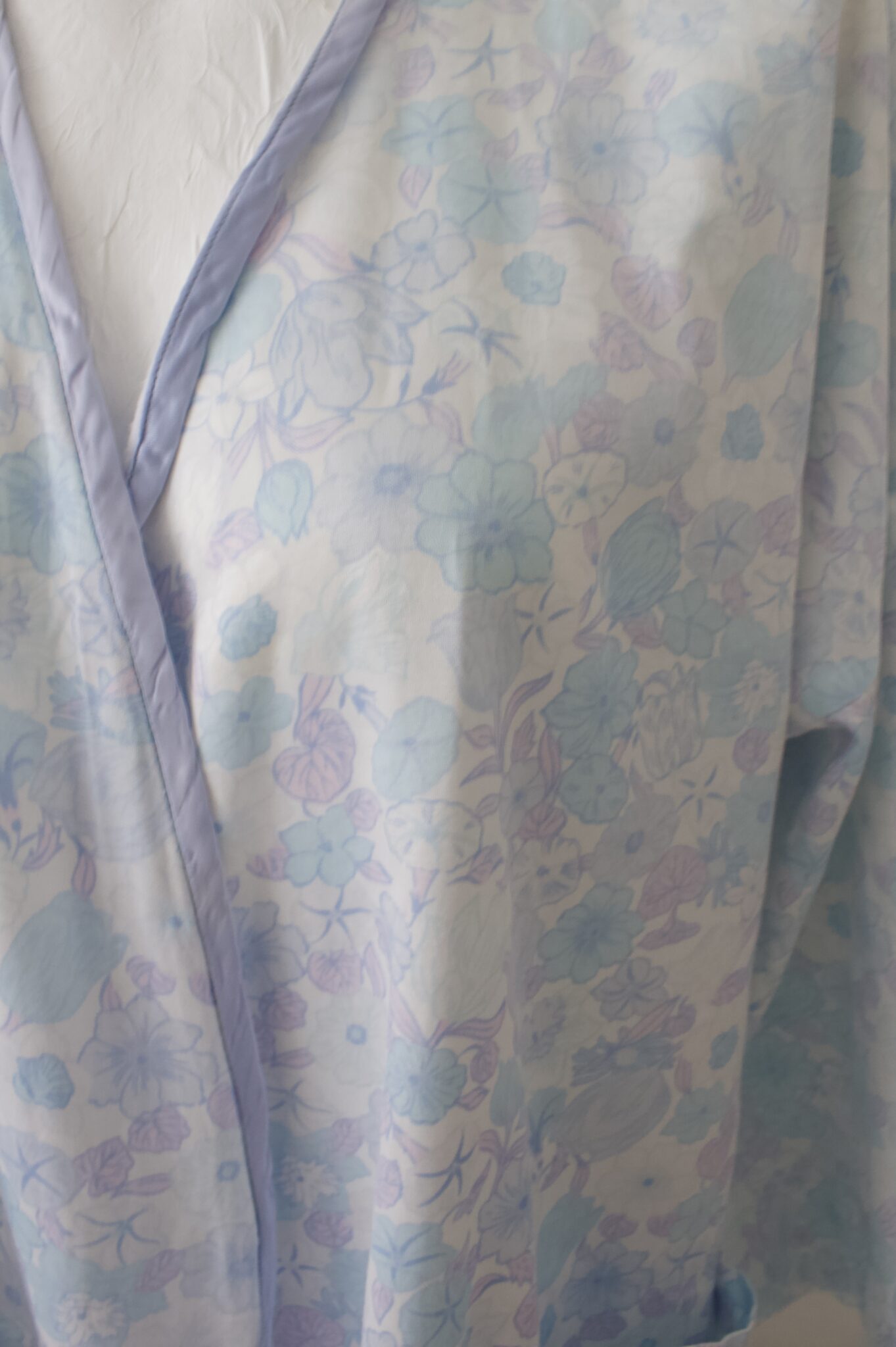 Kaunis vaaleansini lila kukallinen hieman kiiltäväpintainen aamutakki.