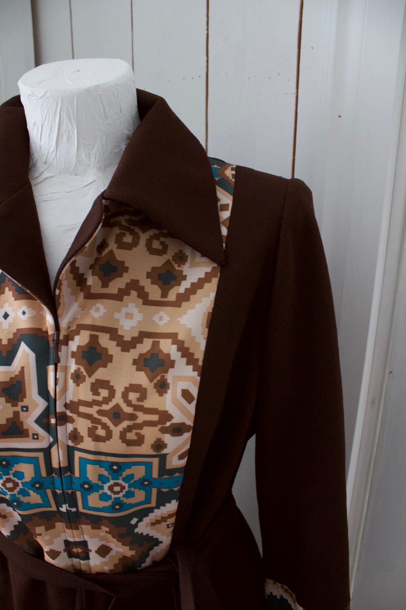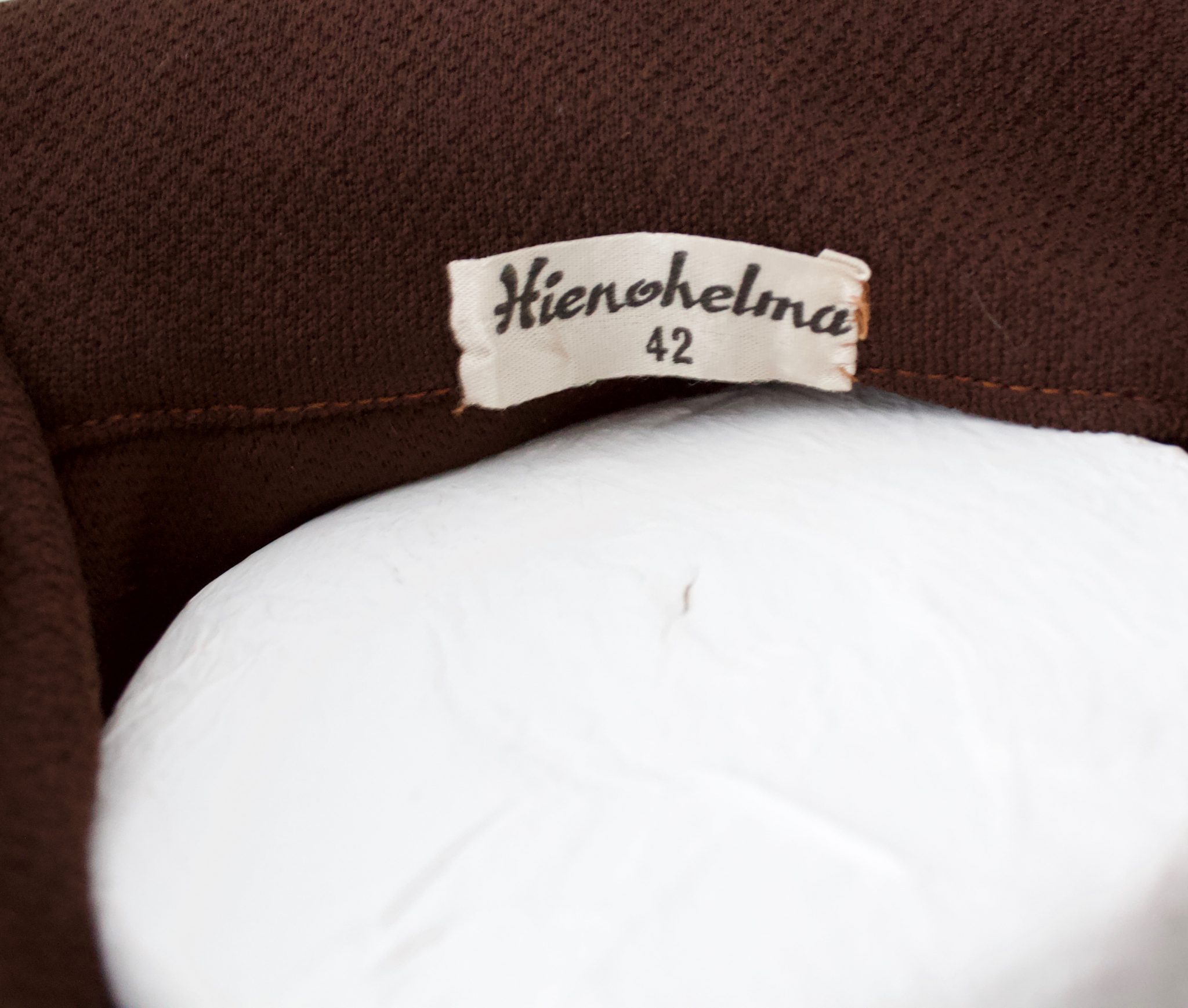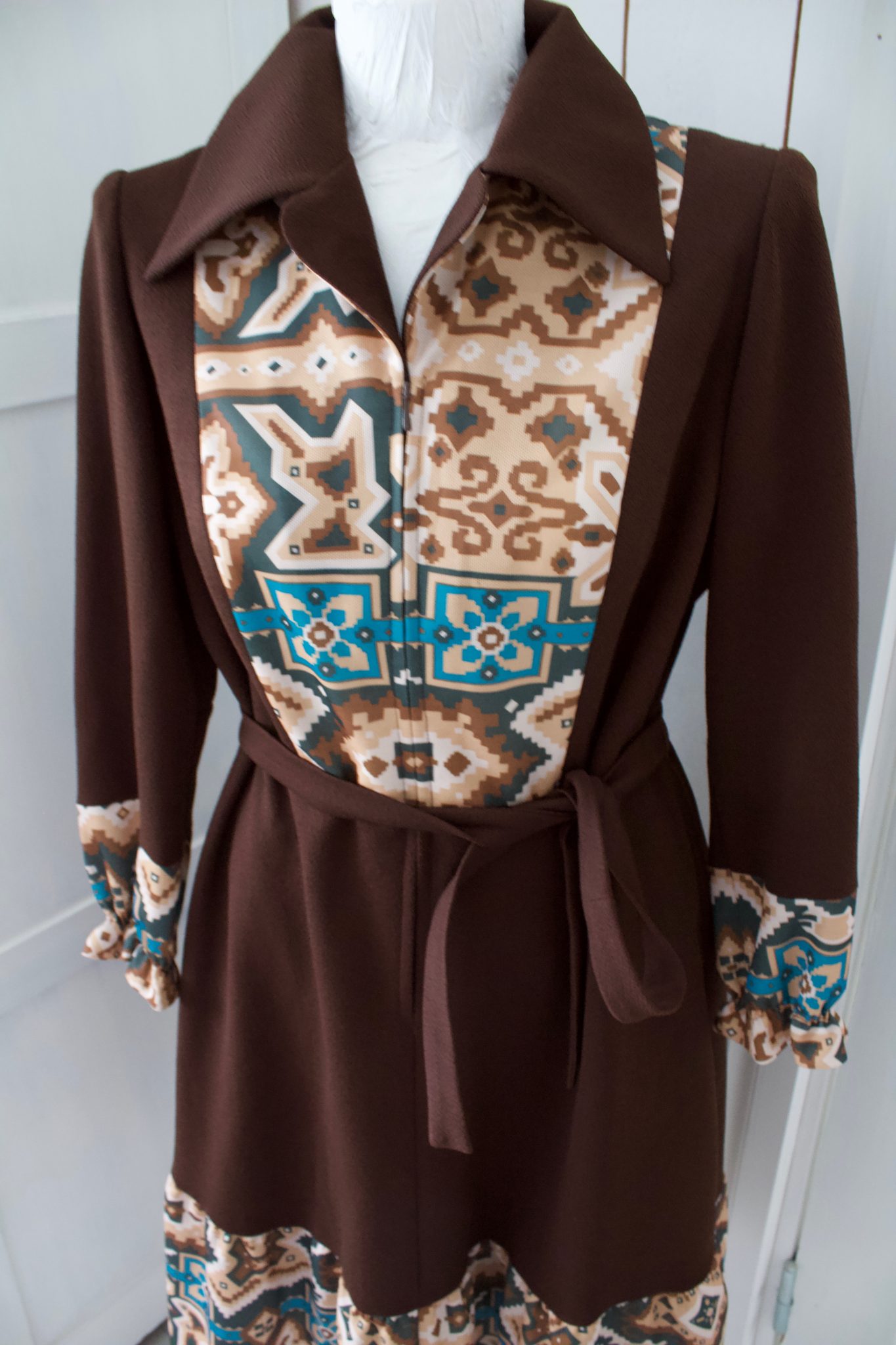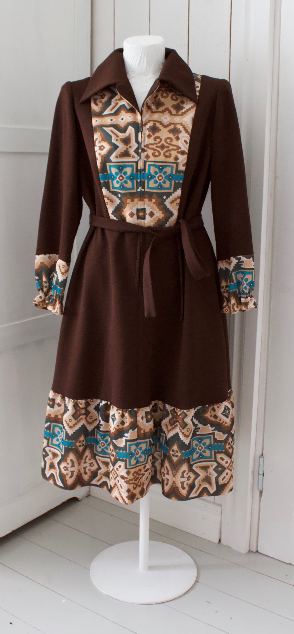 60-luvun ruskea vintage mekko, jossa edessä piilovetoketju. Vyötäröllä irroitettava nauha. Alaosa vuoritettu. Todella hyvässä kunnossa.