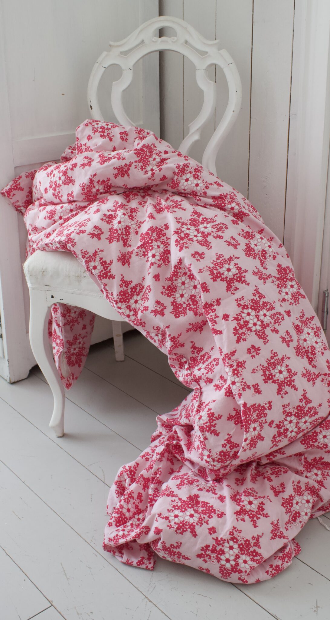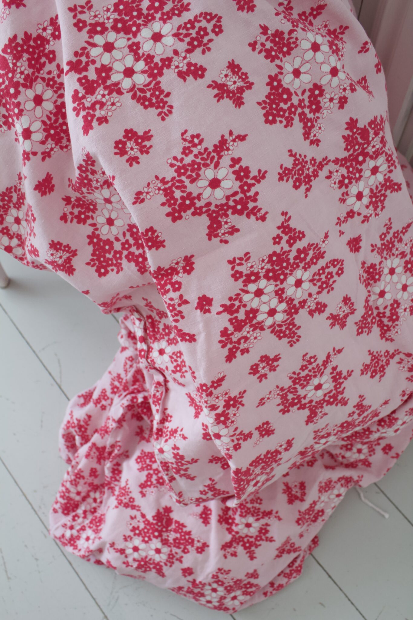 Vanha puuvilainen pinkki pussilakana kukkakuvioin.