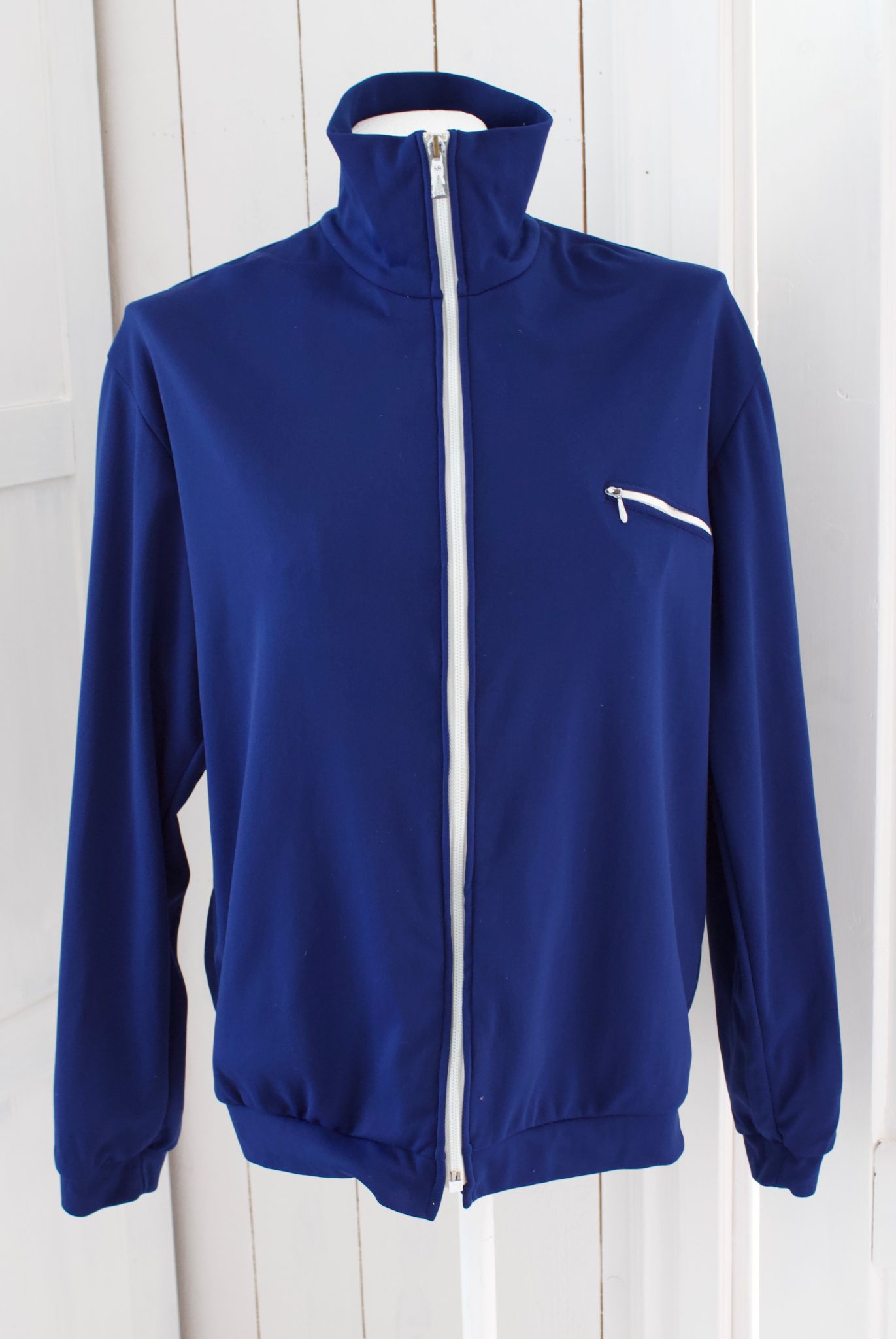 Sininen vintage verkkaritakki valkoisella vetoketjulla ja yhdellä rintataskulla. Unisex malli.