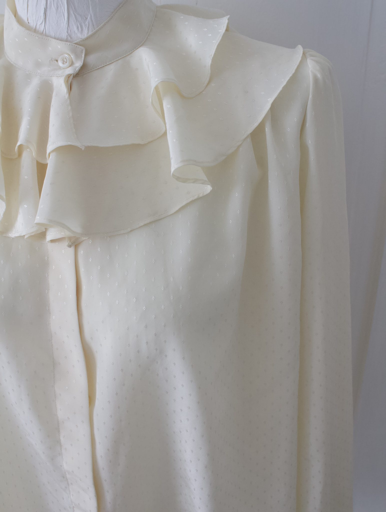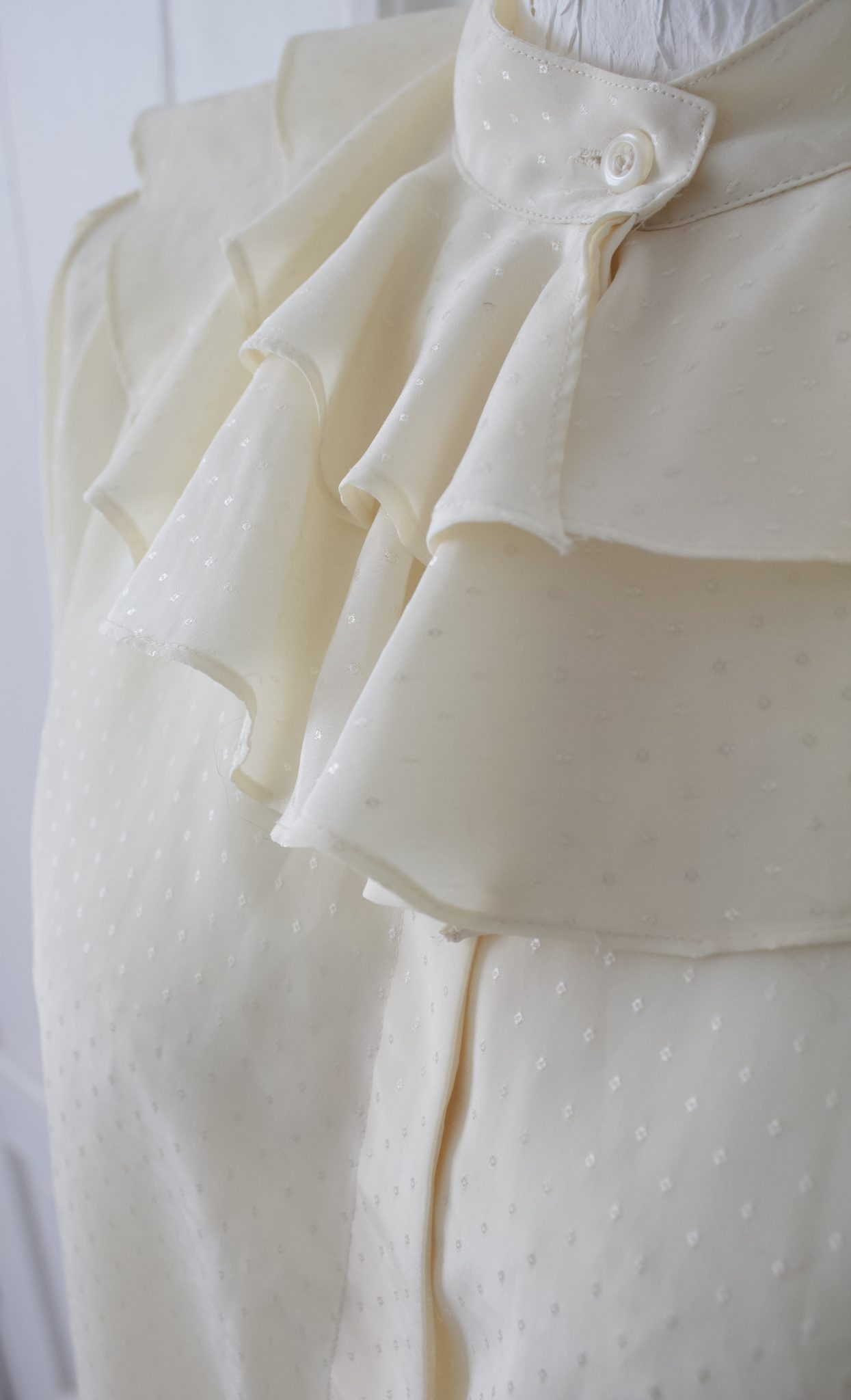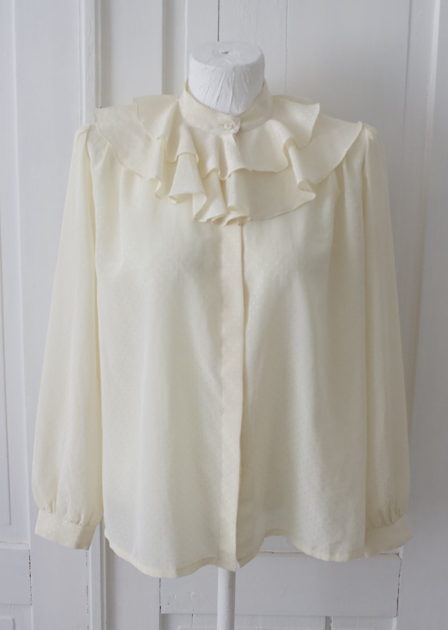 Kaunis luonnonvalkoinen röyhelökauluksellinen vintage paita, jossa edessä piilonapitus ja hihoissa nappi kiinnitys.