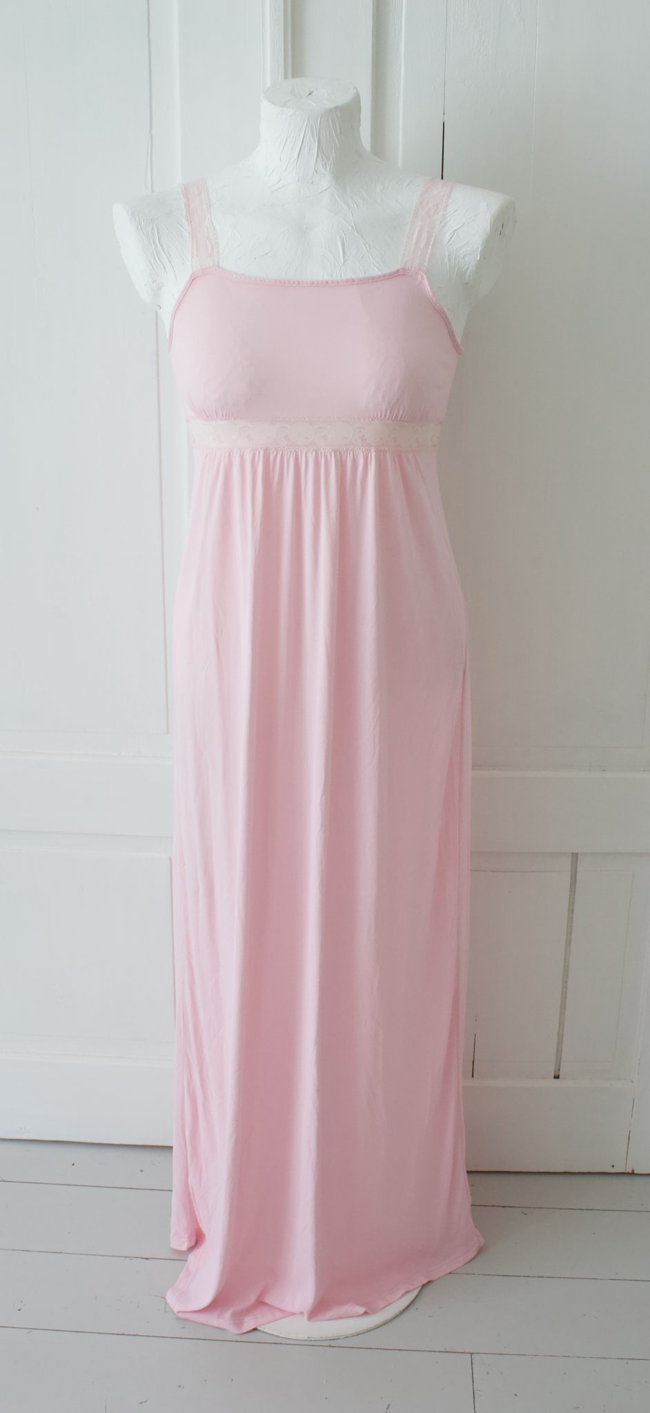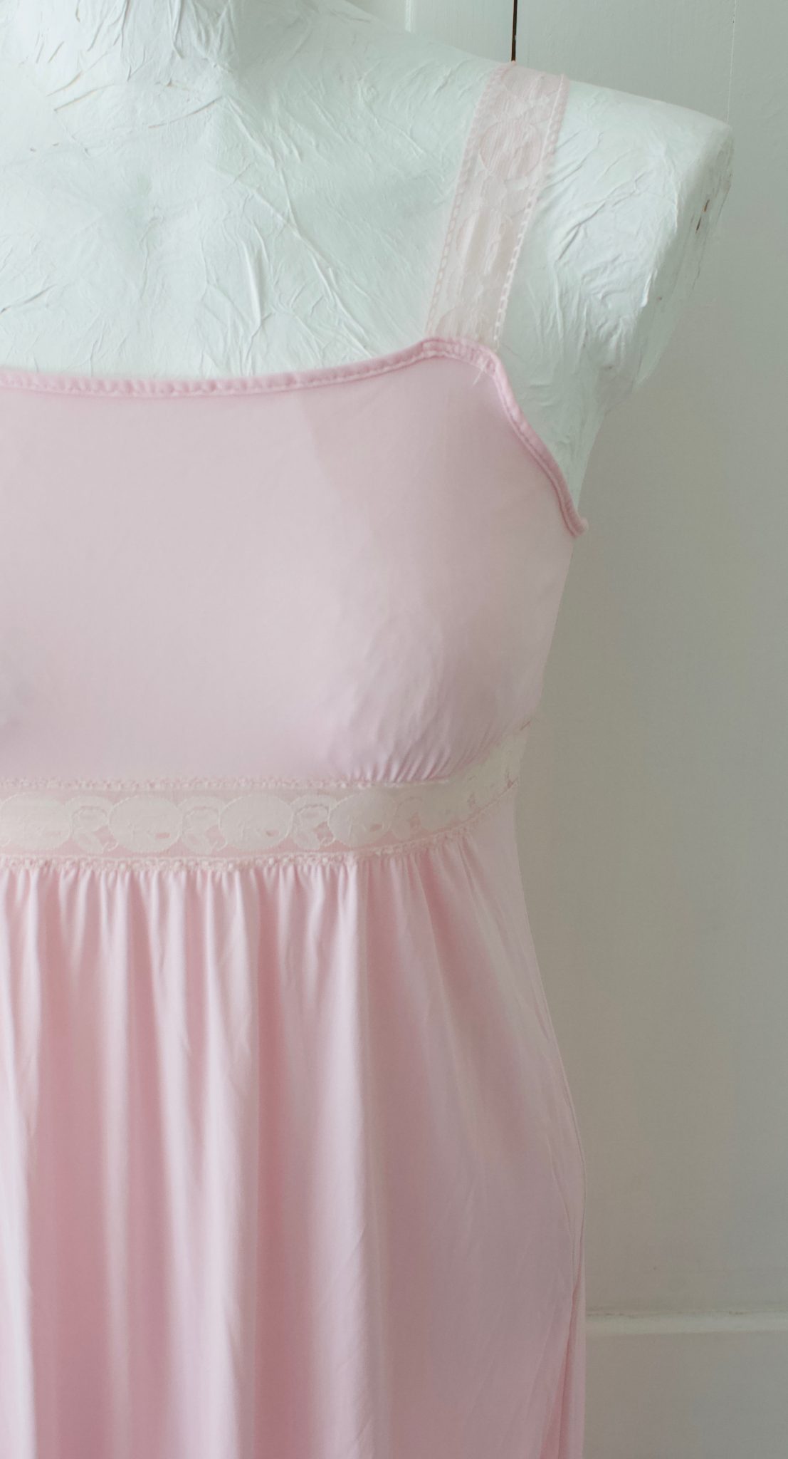 Kaunis vaaleanpunainen pitkä vintage yömekko, jossa pitsiset olkaimet ja pitsinen koriste rintojen alla.